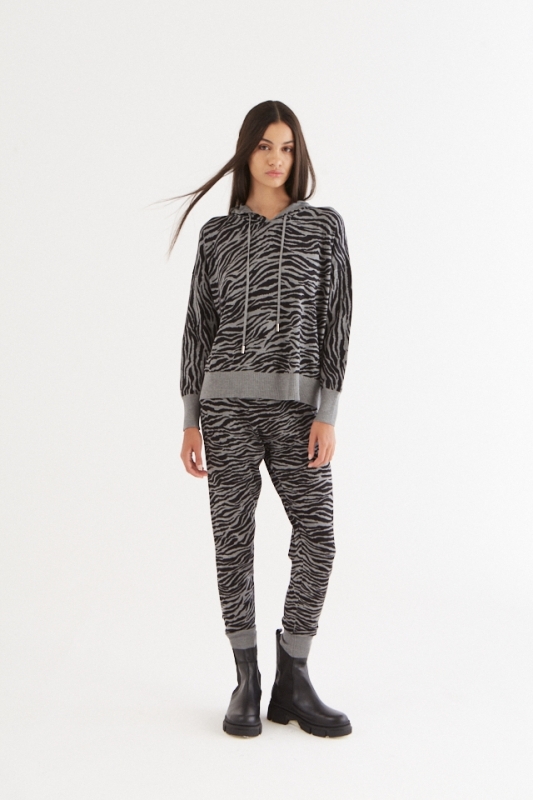 Babucha tejida print cebra. Elástico y ajuste en cintura. Terminales y chapita metálica con logo.
