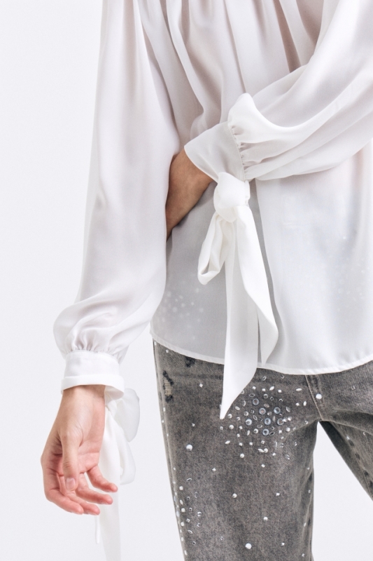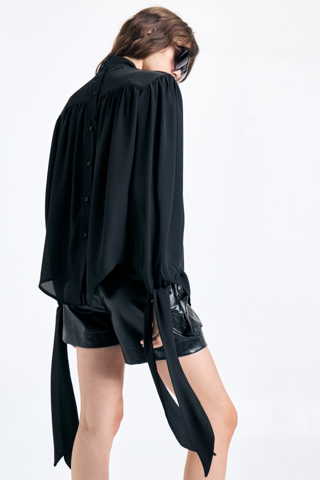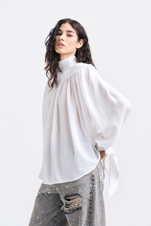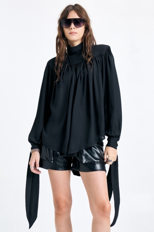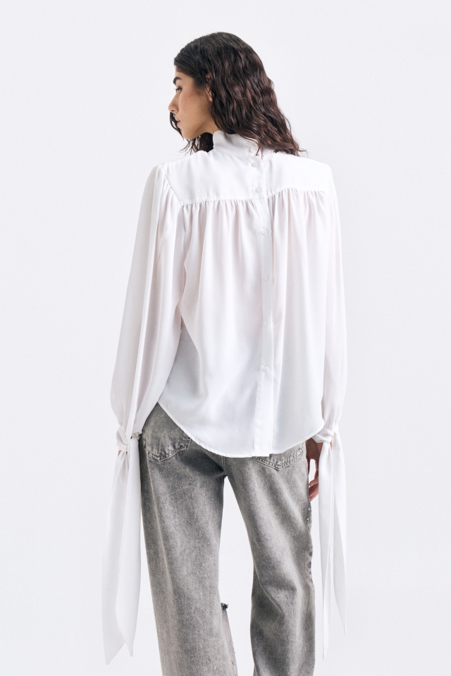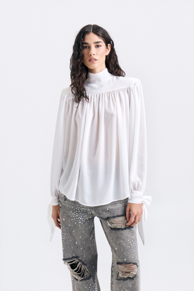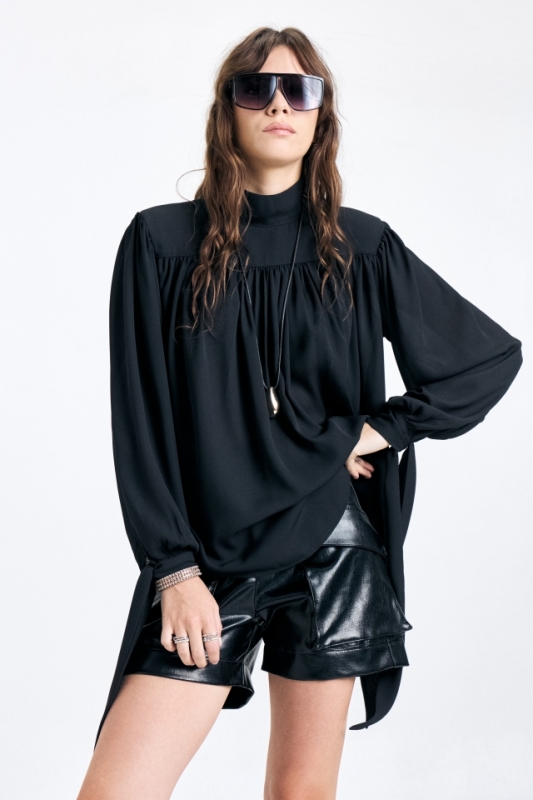Blusa de calce amplio con canesú delantero y cuello alto tipo polera. Mangas largas con lazos en extremo para atar. Acceso con cartera con botones al tono. Cuenta con chapita metálica con identificación de marca grabada.