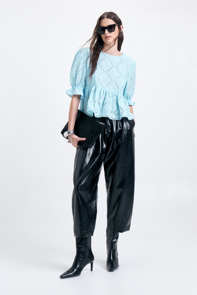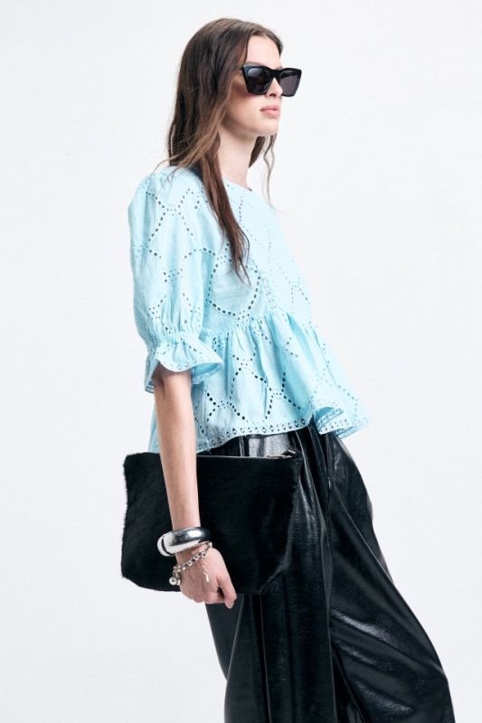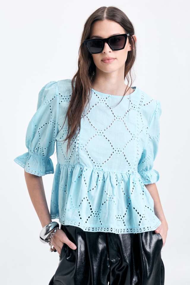 Blusa con detalles en broderie, recorte en cintura y mangas cortas con volado.Chapita metálica con identificación de marca en centro espalda.