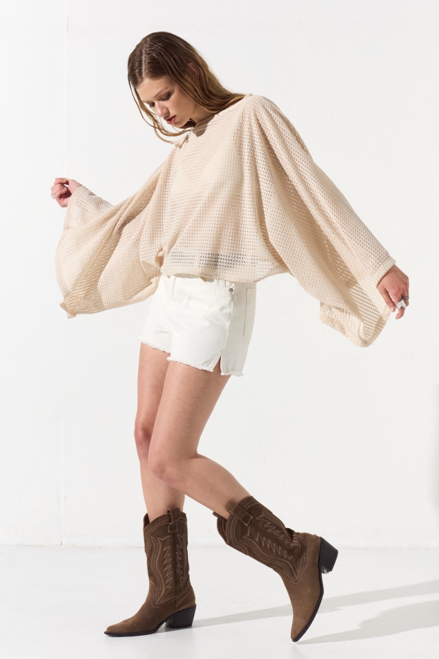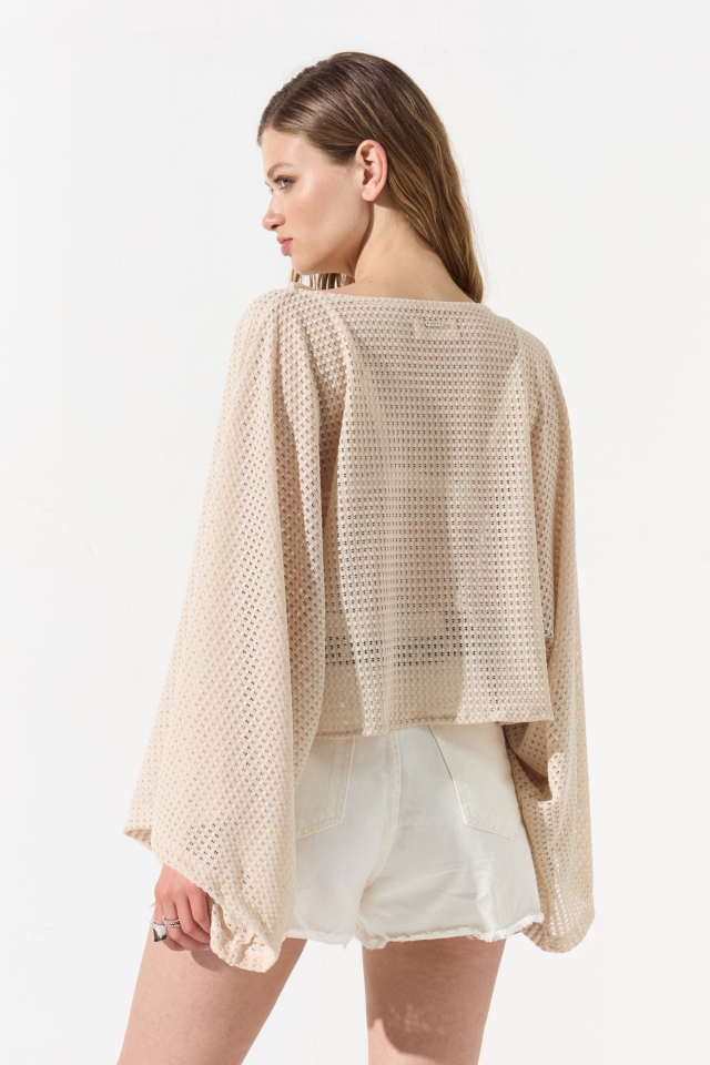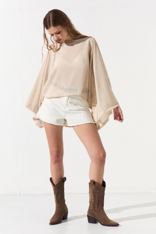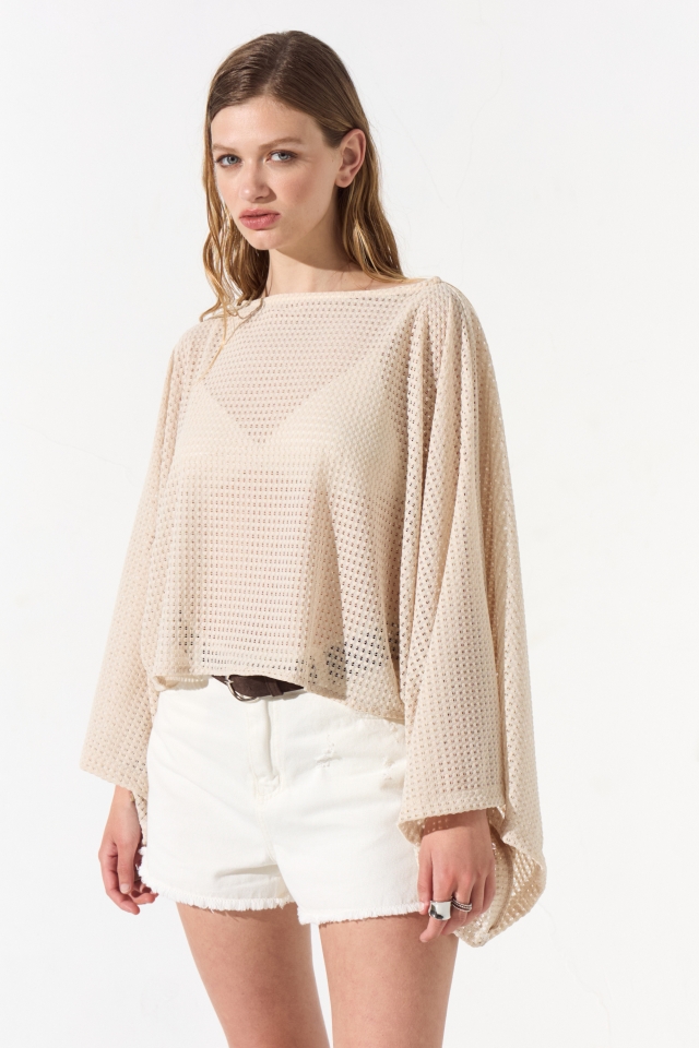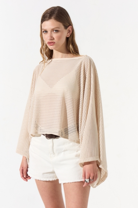 Blusa de crochet con corte poncho, posee un escote bote y su caja es amplia, en el interior de sus hombros lleva cinta bebe que permite colgar la prenda.