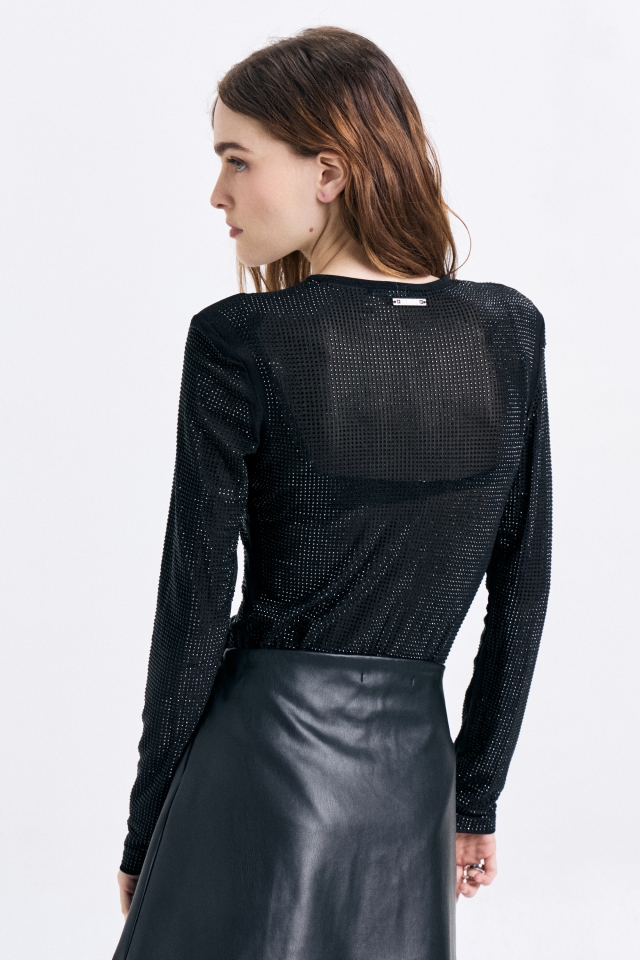Body confeccionado en microtul terminado con aplicación de hotfix al tono en su totalidad.Tiene escote redondo y mangas largas.