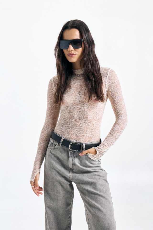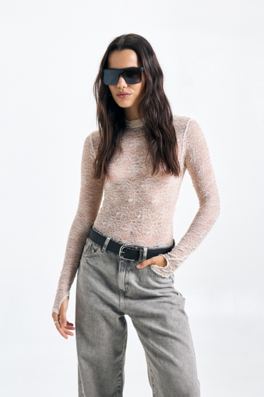 Body de encaje tramado manga larga con cuello media polera, para acceder la prenda cuenta con broches. A modo de detalle cuenta con una chapita que lleva identificación de marca en el centro de su espalda.