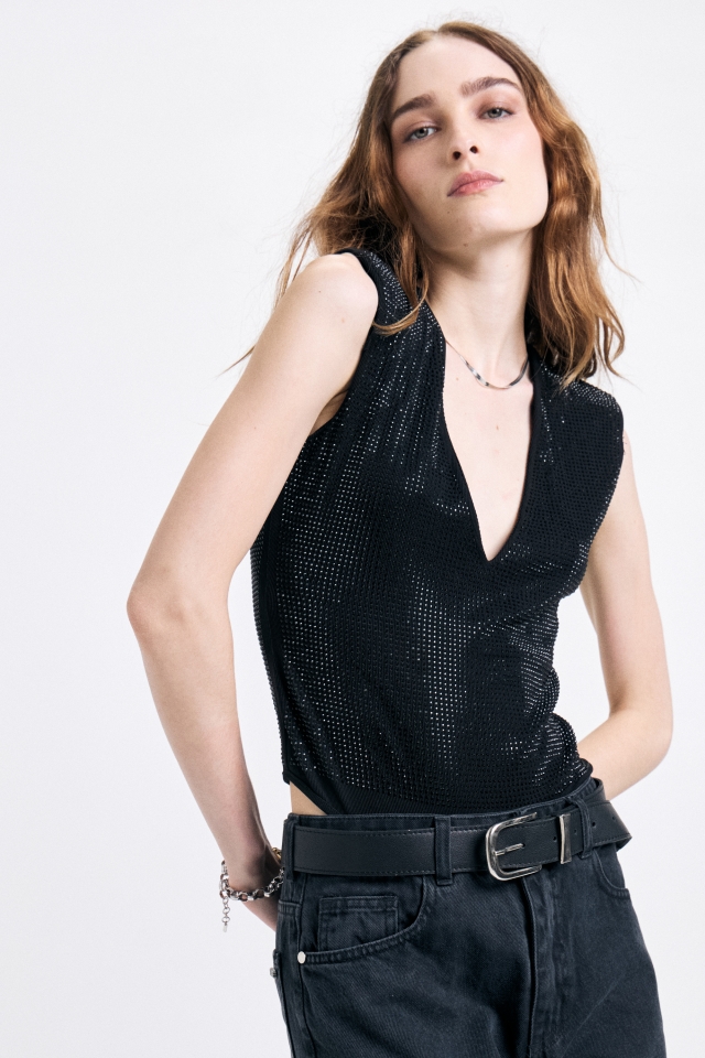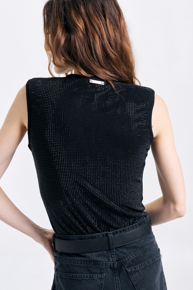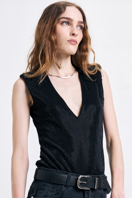 Body confeccionado en microtul terminado con aplicación de hotfix al tono en su totalidad.Tiene escote redondo y mangas largas.