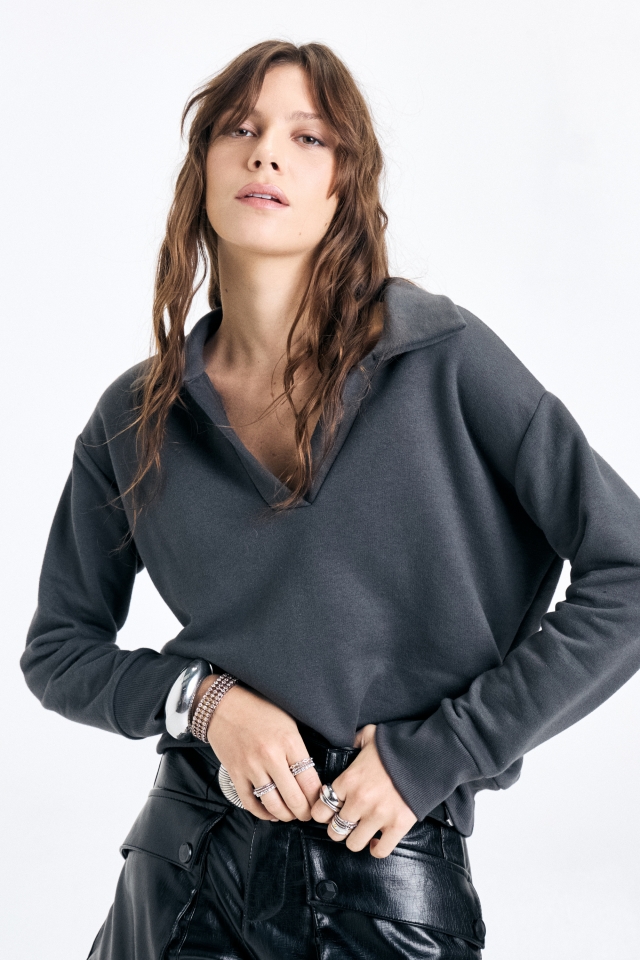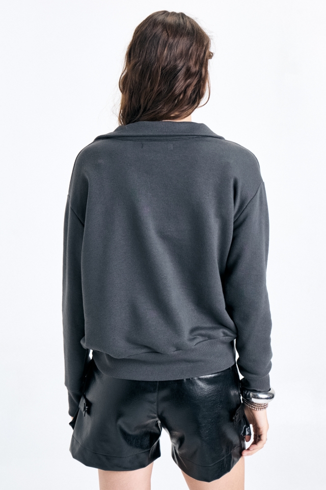 Buzo de rústico con escote v estilo polo. En delantero inferior izquierdo lleva badana de marca. Composición: 80% algodón 20% poliéster