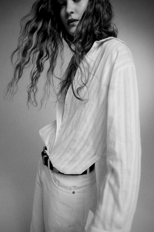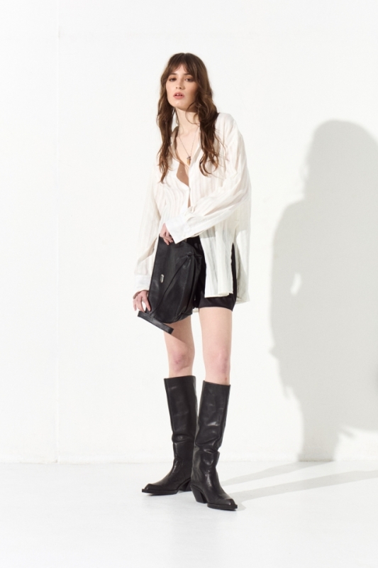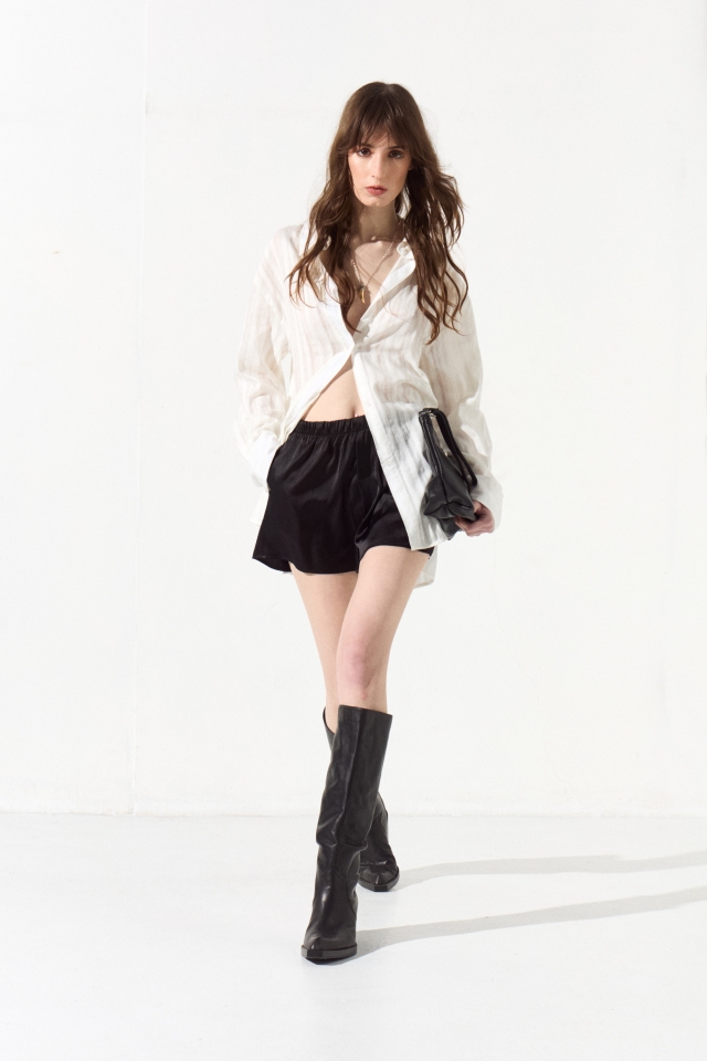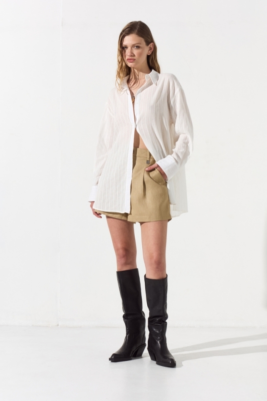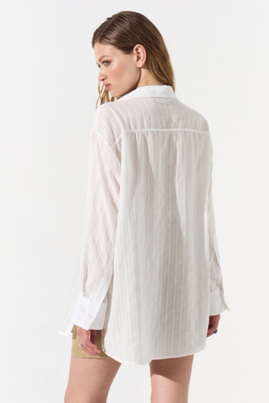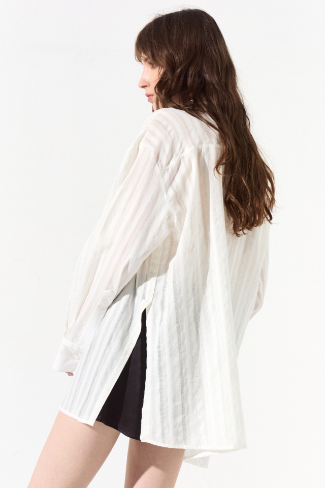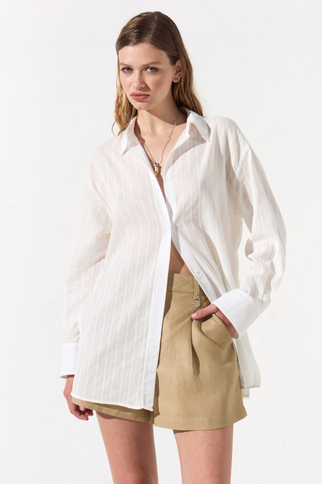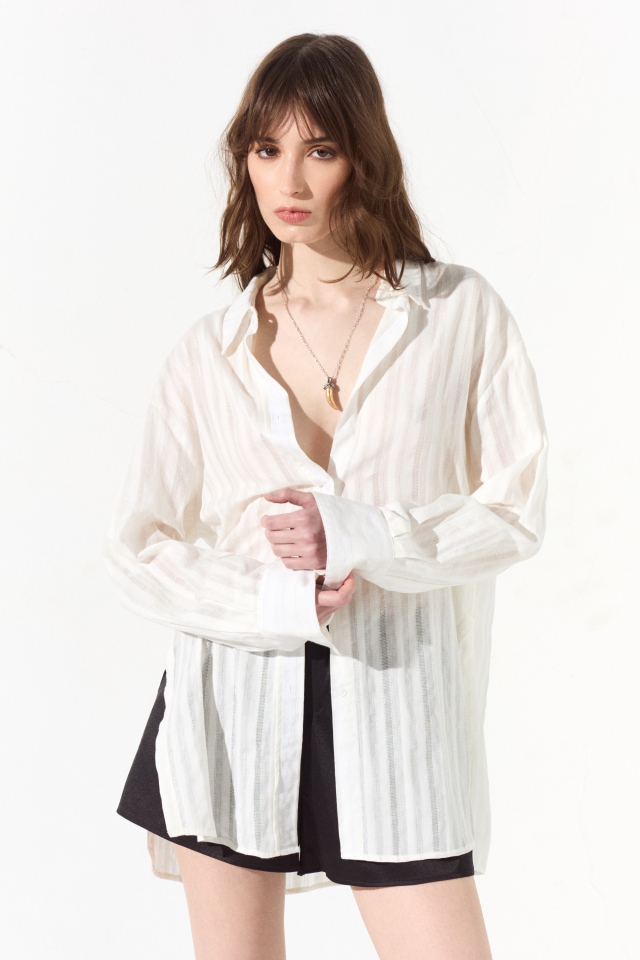 Camisa de entalle clásico, posee tajos en los laterales y botones grabados con la identificación de marca. La tela está labrada y con detalle de líneas en lurex dorado. Composición: 100% Algodón