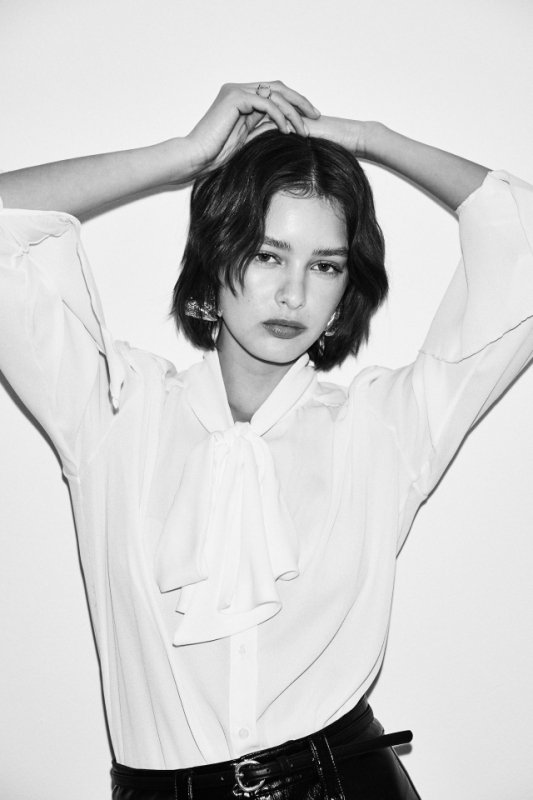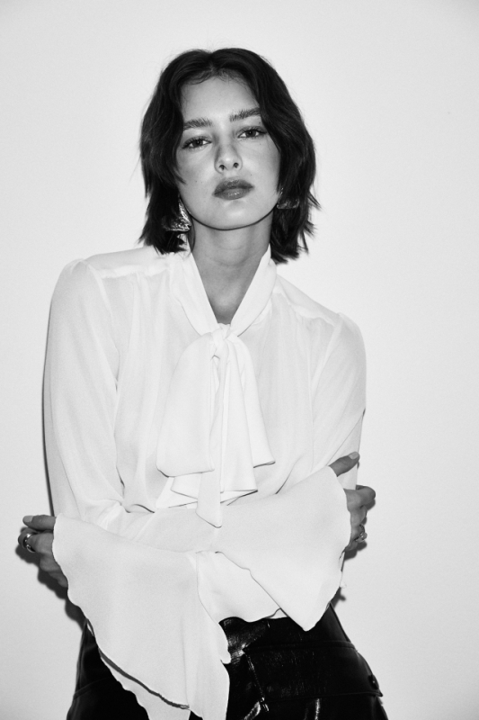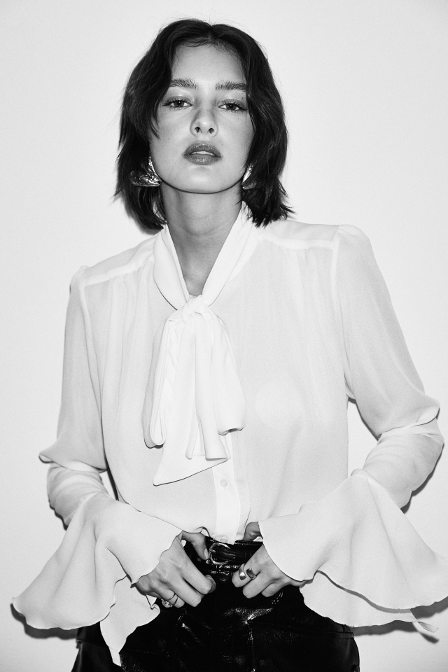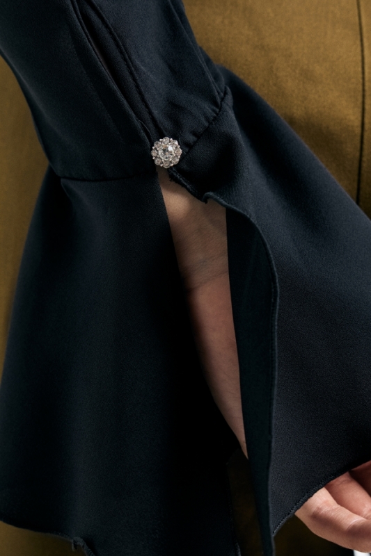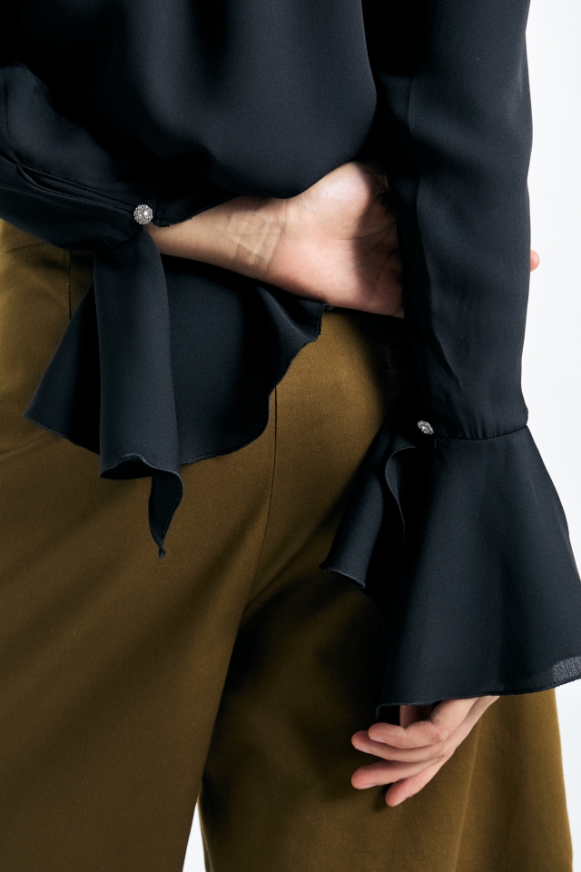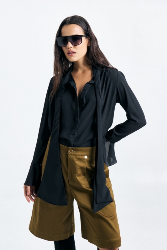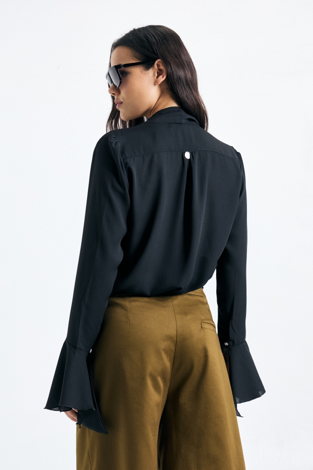 Blusa confeccionada en gasa creppé con cartera y botones al tono. Además cuenta con lazo para atar en cuello y mangas con puño acampanado. También lleva chapita metálica con identificación de marca. Composición: 100% poliéster