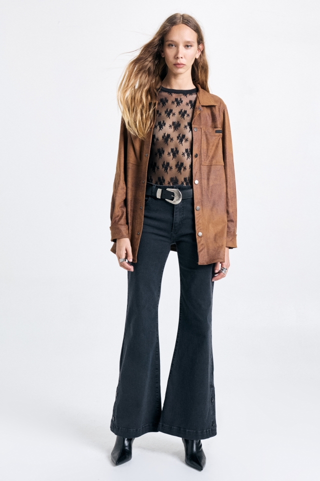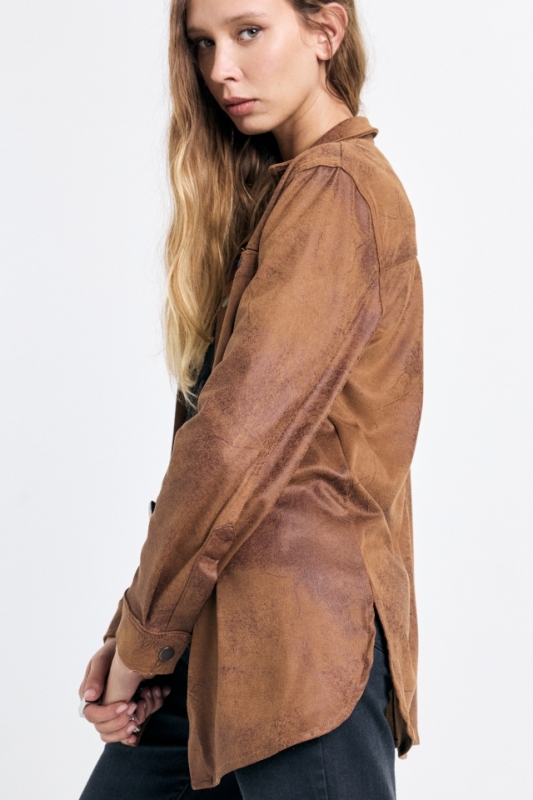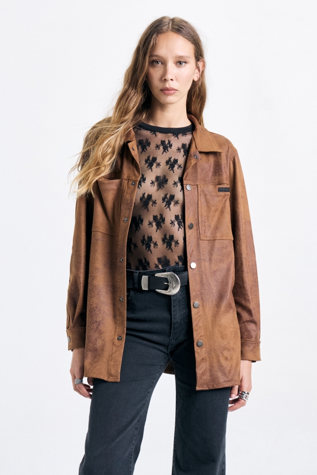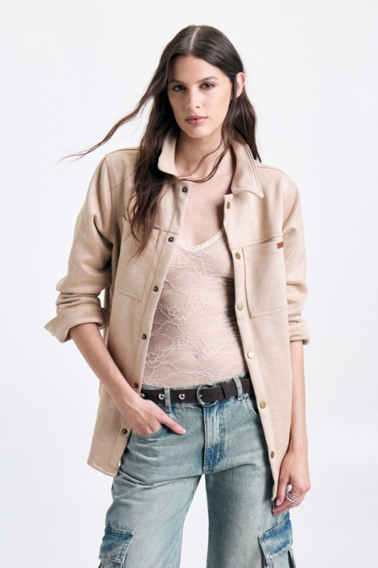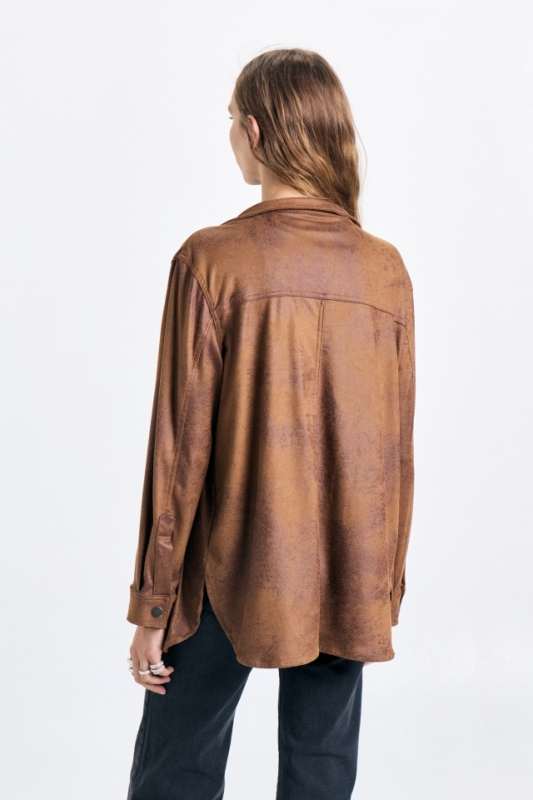 Camisa de gamuza oversize, posee bolsillos superpuestos delanteros, está complementado con botones de broche, a modo de detalle en uno de sus bolsillos lleva una badana con inscripción de marca. Composición: 96% Poliester 4% Lycr