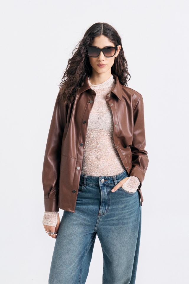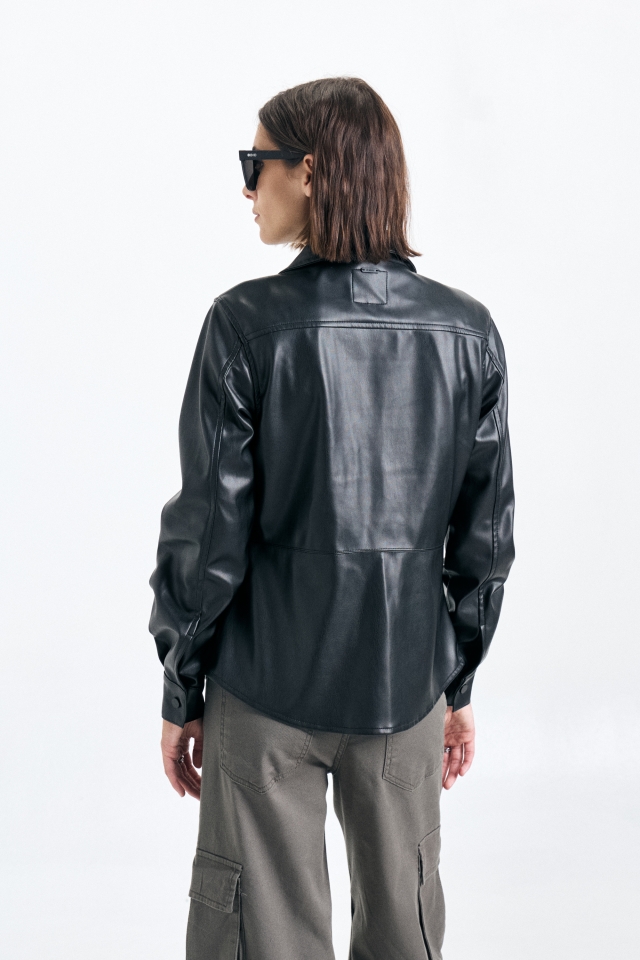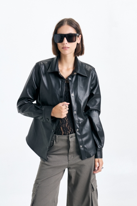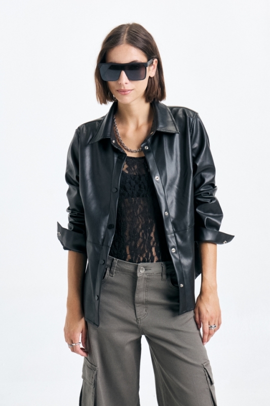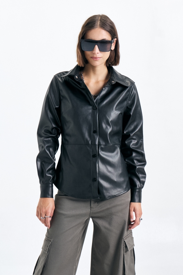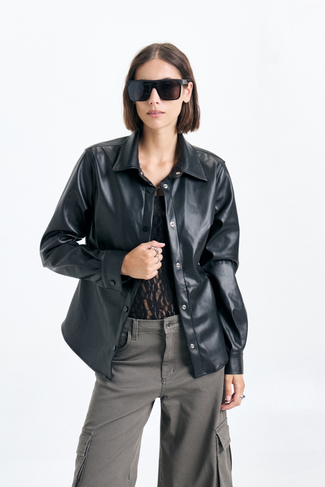 Camisa de cuero con detalle de recortes y avíos metalicos personalizados.Composición: 100% PU