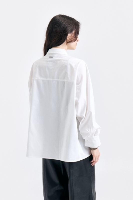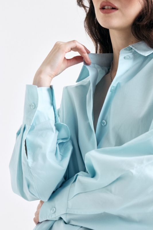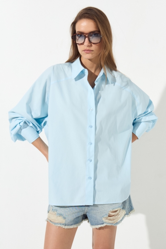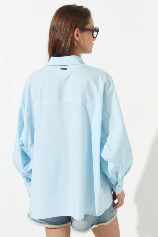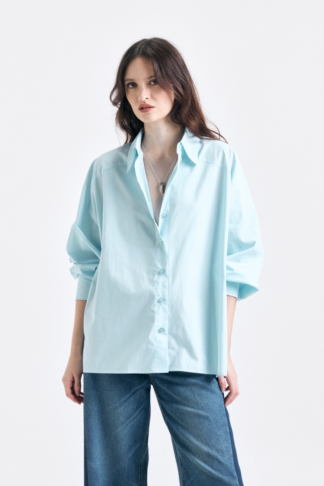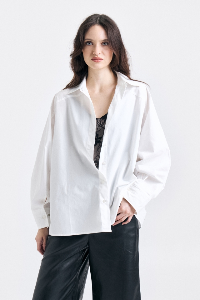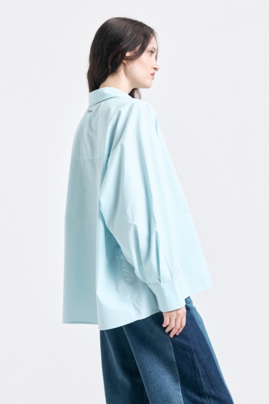 Camisa oversize de poplin, con canesú y mangas largas con recortes. Detalle en puños y botones camiseros al tono.