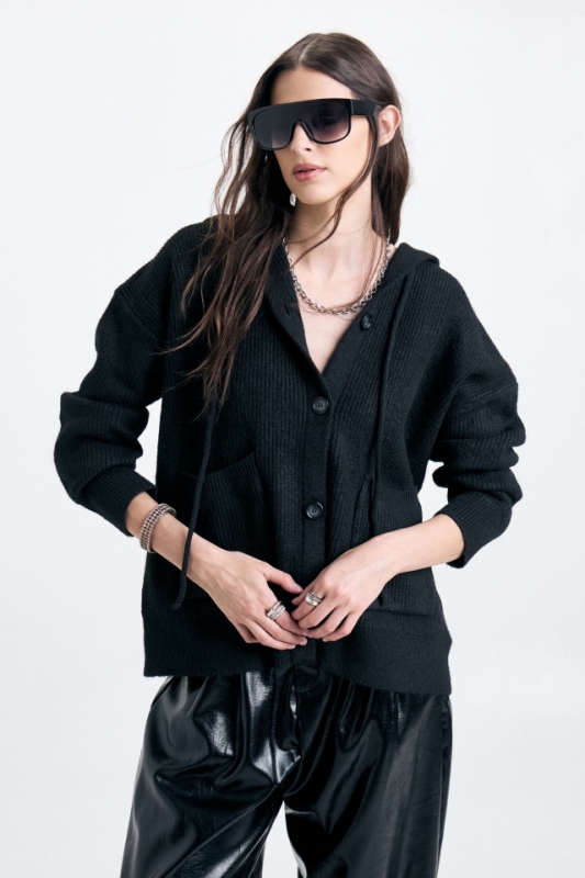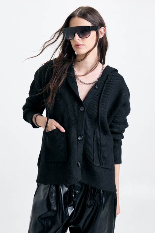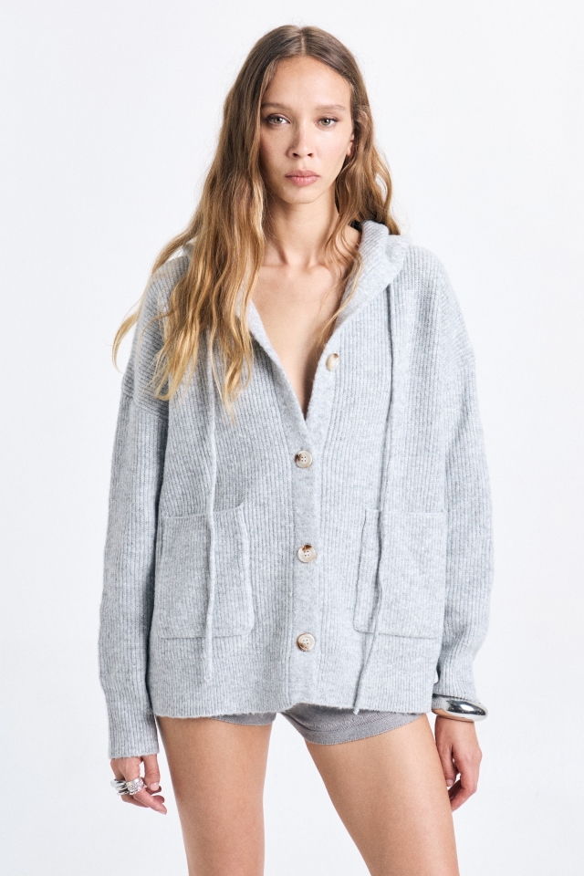 Campera tejida de calce amplio, con capucha y acceso con botones marmolados.