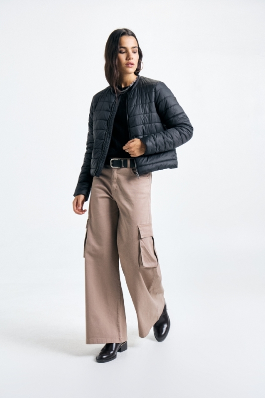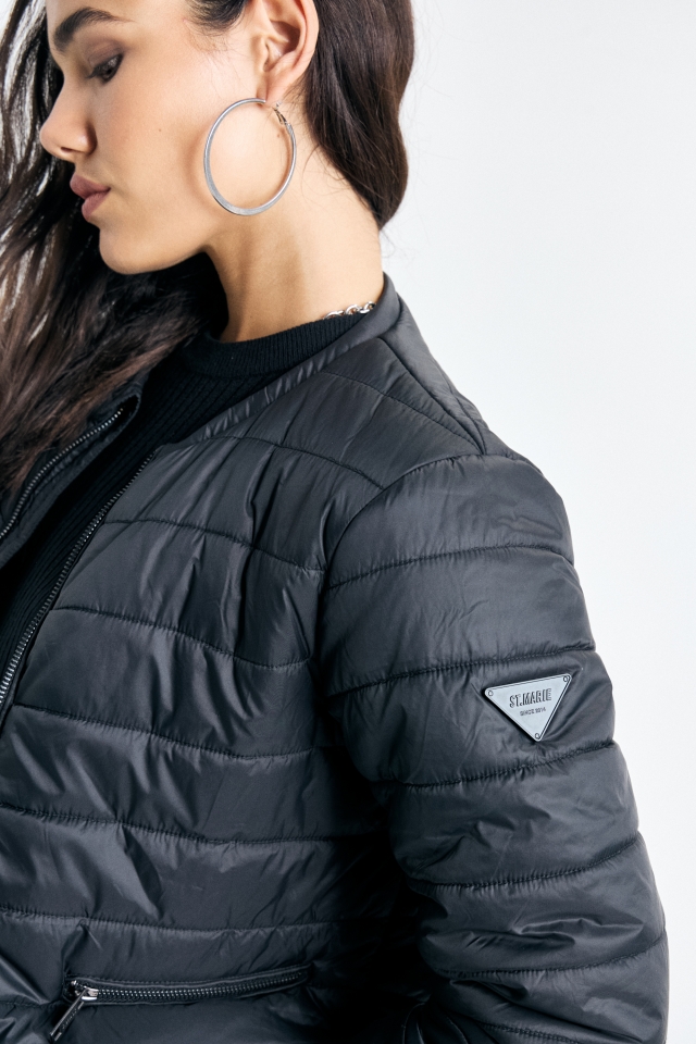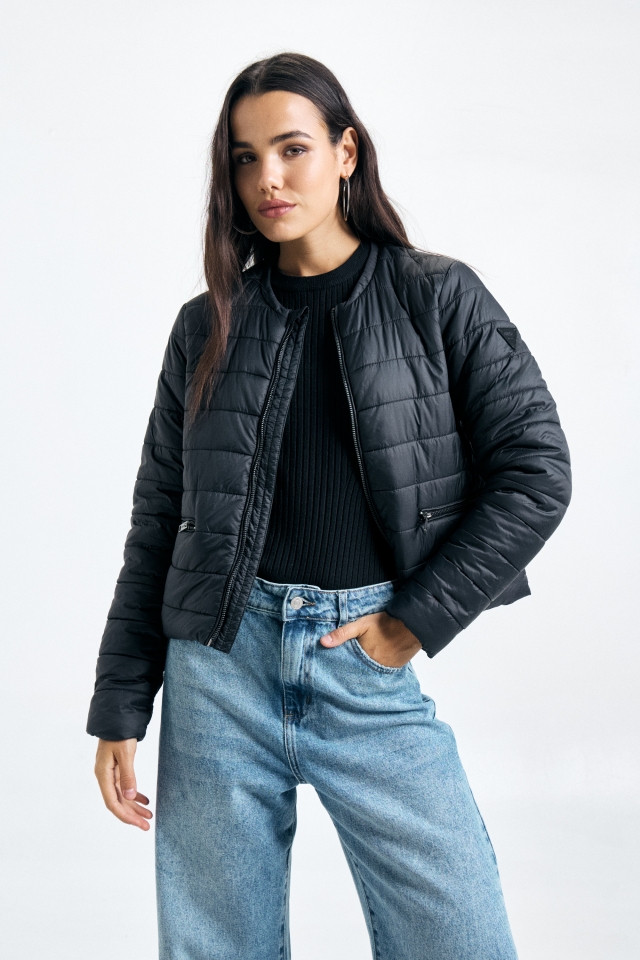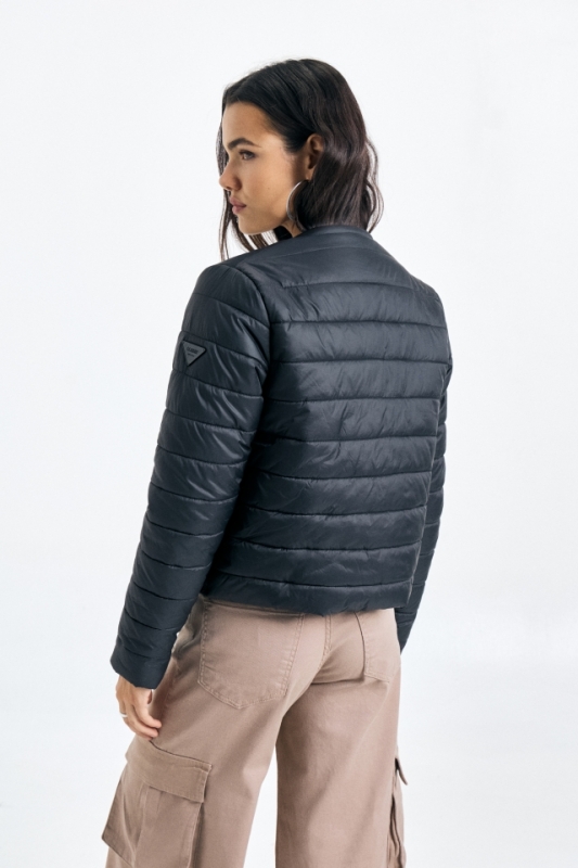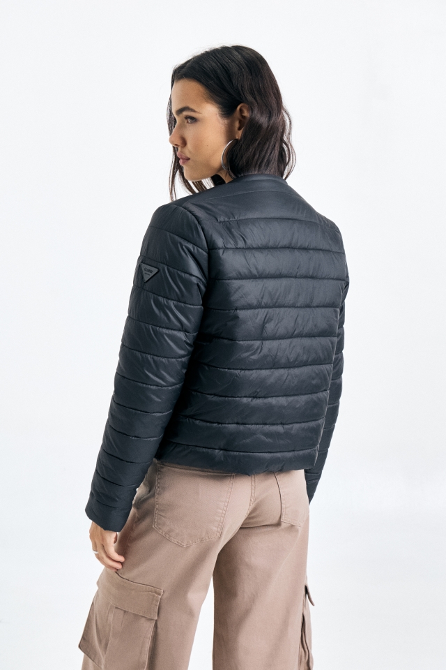 Campera puffer de estructura definida, cuello a la base y largo por encima de cadera.