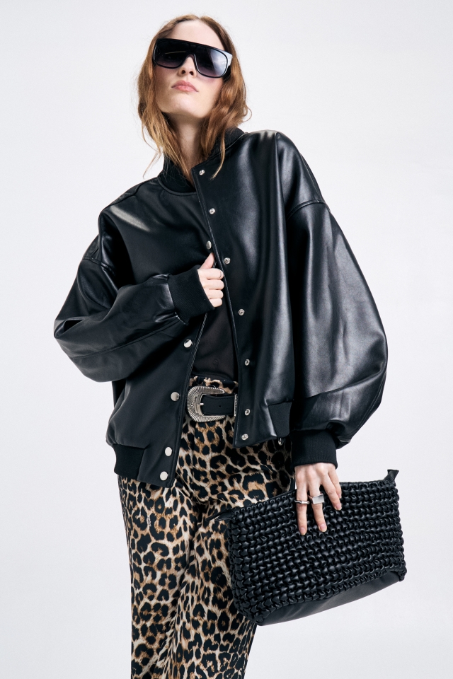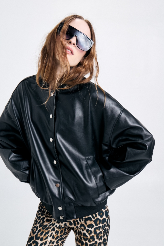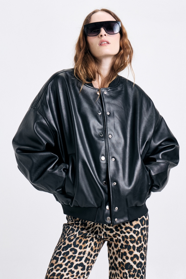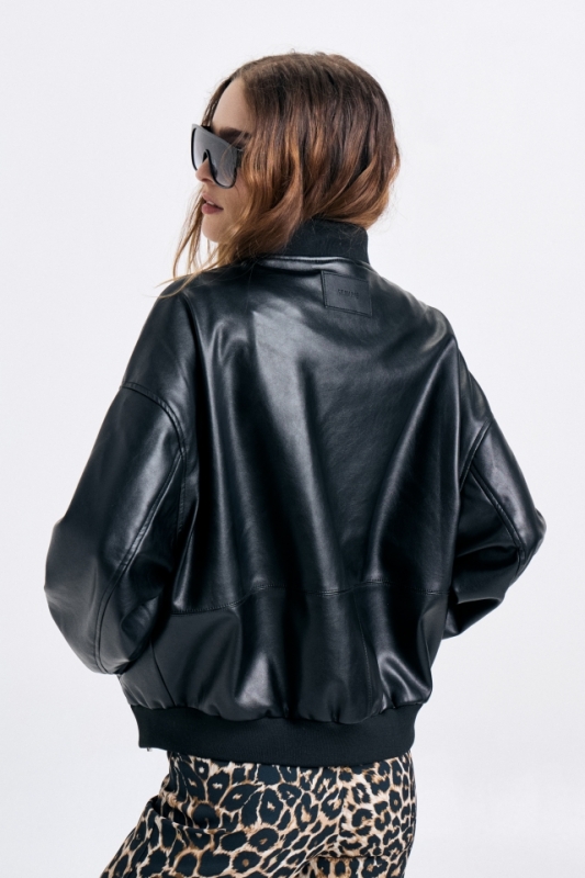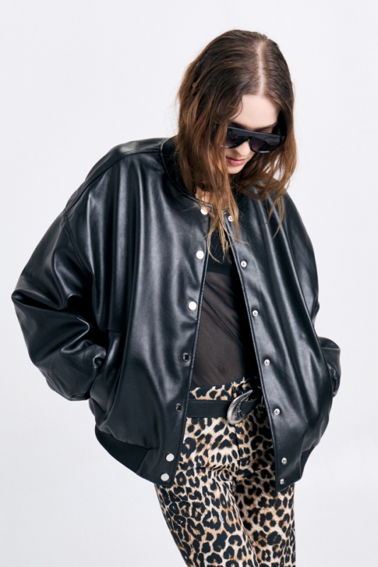 Campera estilo bomber confeccionada en simil cuero. De calce holgado con puños en ribb al tono.Además cuenta con bolsillos en delantero y acceso con broches metálicos.