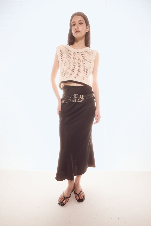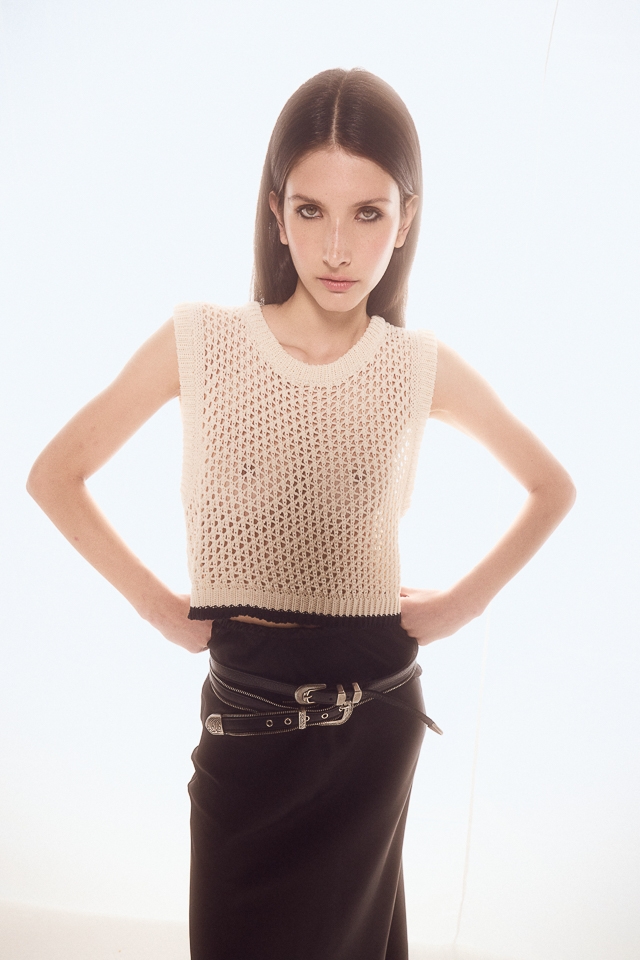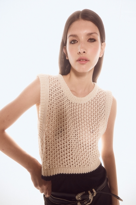 Top tejido en hilado 100% algodón, de escote a la base y hombros anchos.Tiene ruedo a contratono y amplias sisas.Composición: 100% Algodón peinado