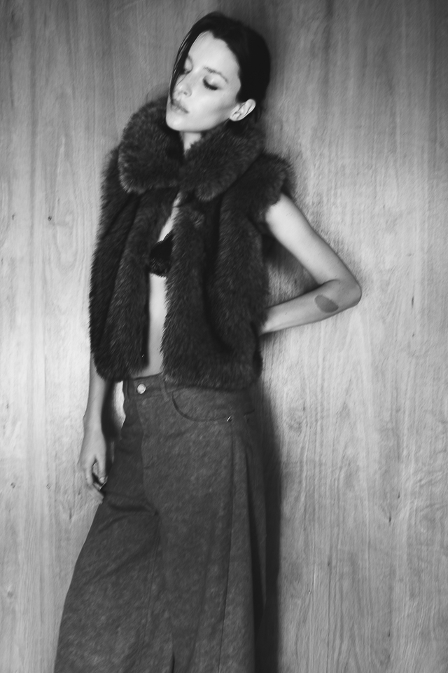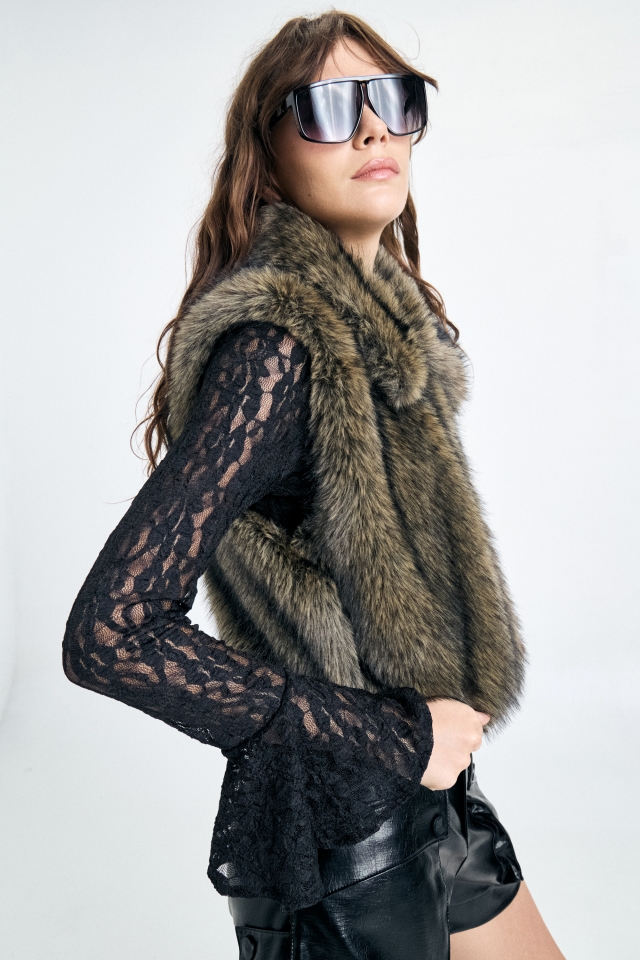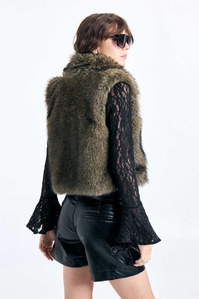 Chaleco confeccionado en piel sintética jaspeada, con forrería de satén. Cierre mediante ganchos peleteros. Composición: 100% poliéster