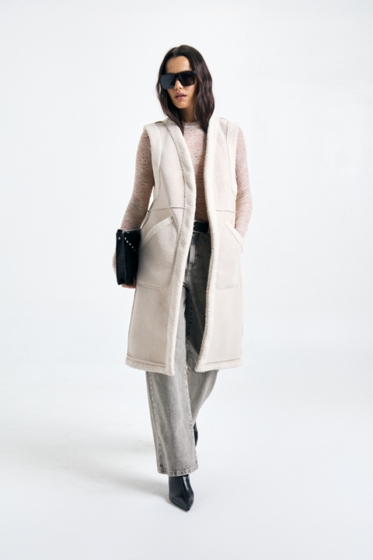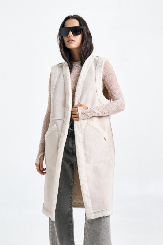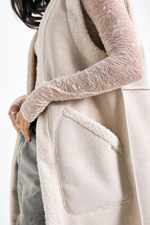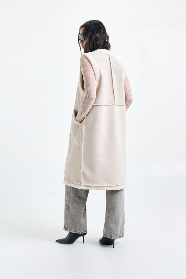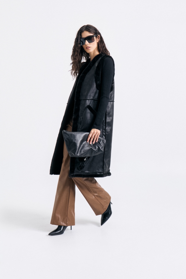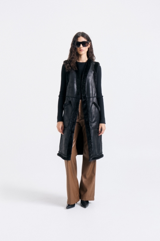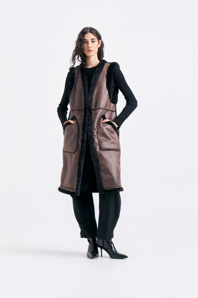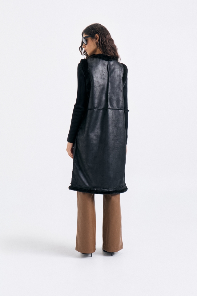 Chaleco de simil cuero con textura y piel sintetica, reversible .Bolsillos en el delantero. Avíos personalizadosComposición: 100% Poliéster