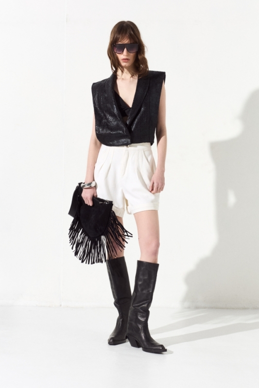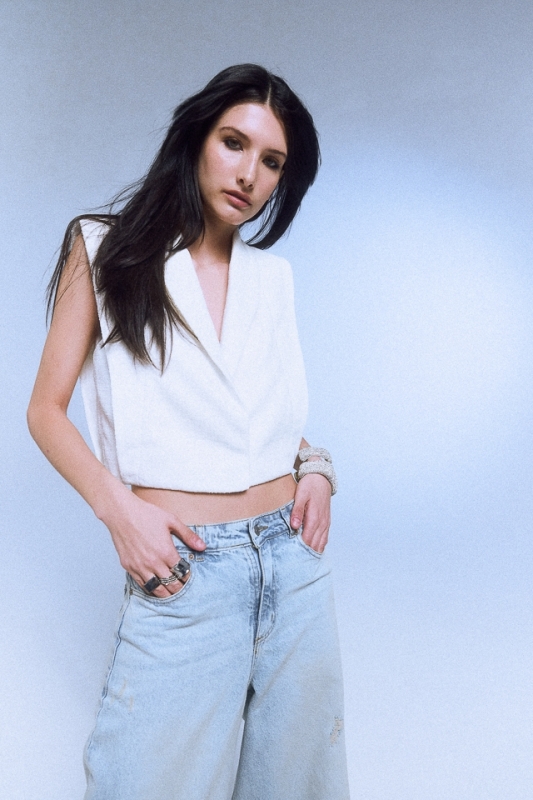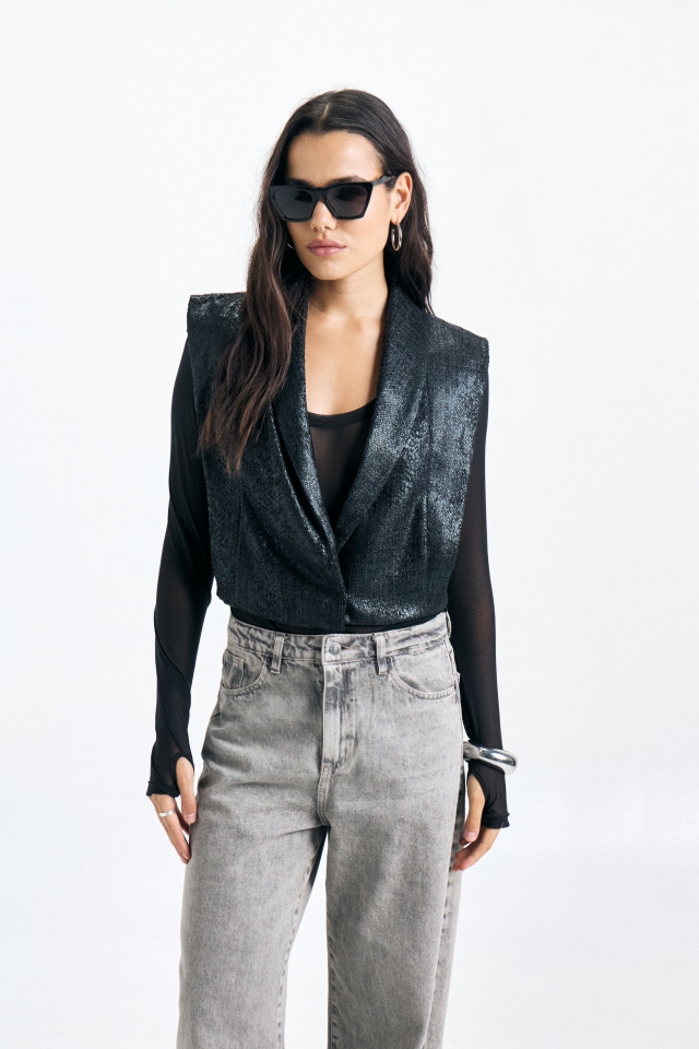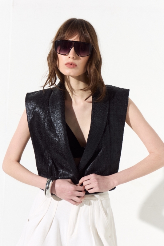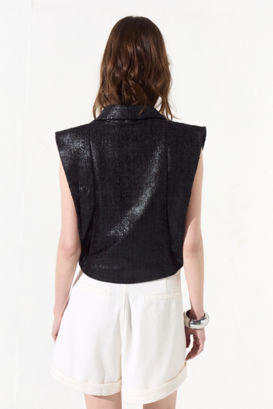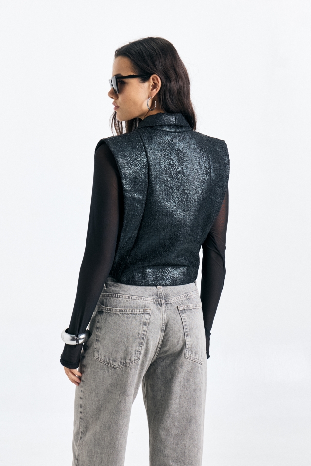 Chaleco sastrero en paño texturizado. Presenta solapas tipo smoking, silueta de