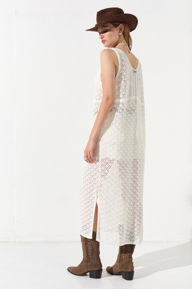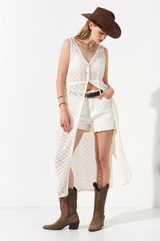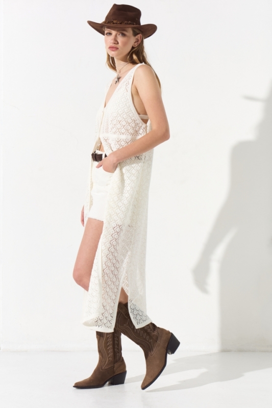 Chaleco tejido de calce holgado y largo por encima de tobillos. Tiene escote V que culmina en cartera con botones al tono. Además lleva grifa metálica con identificación de marca grabada.