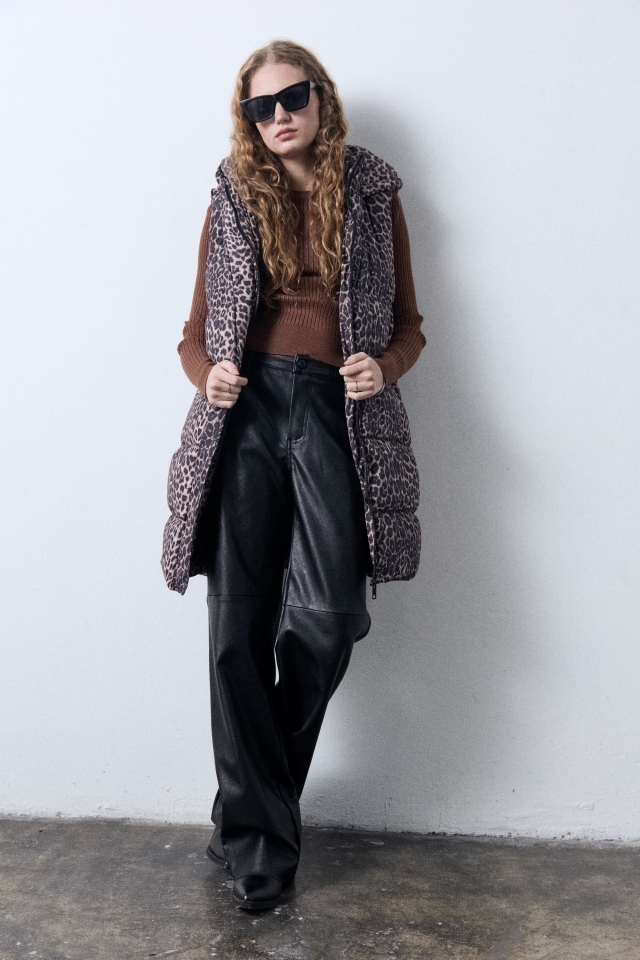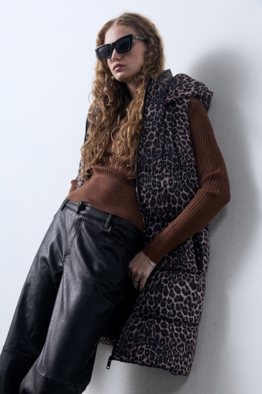 Chaleco puffer largo con capucha con badana de goma con identificaciónde marca con relieve. Tiene avíos al tono.