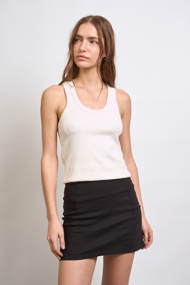 Short pollera mini de bengalina, lleva dos recortes en el delantero y el trasero. A modo de detalle en la cintura se le colocó una chapita metálica con la identificación de marca.
