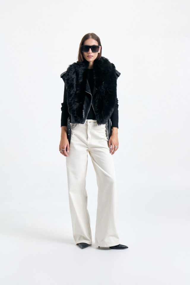 Jean recto de tiro alto, su calce es wide leg, y posee cinco bolsillos, los cuales están terminados con snaps metálicos.