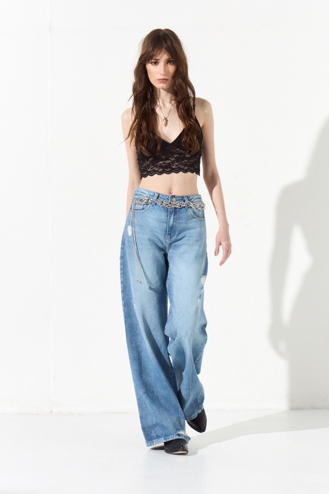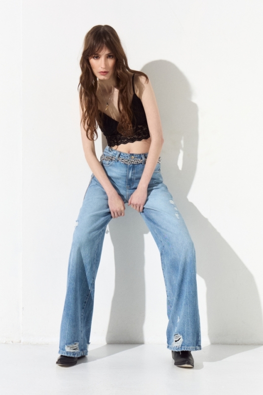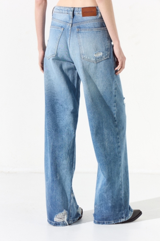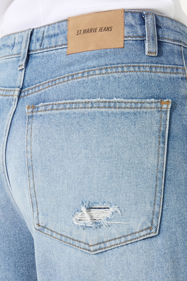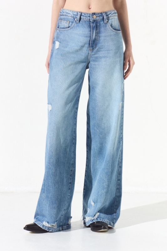 Jean 5 bolsillos recto de tiro medio y pierna holgada con detalles de roturas. Tiene largo al tobillo. Presenta un lavado con efecto quebrado