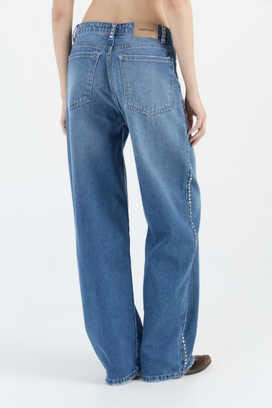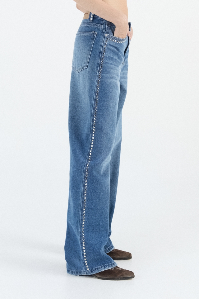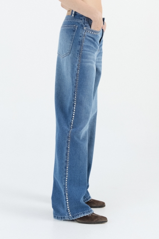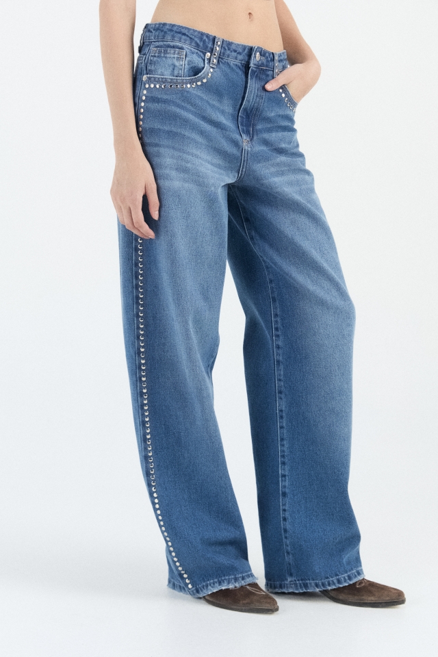 Jean calce wide tiro alto rigido 5 bolsillos. Largo al piso. Con tachas plata en lateral
