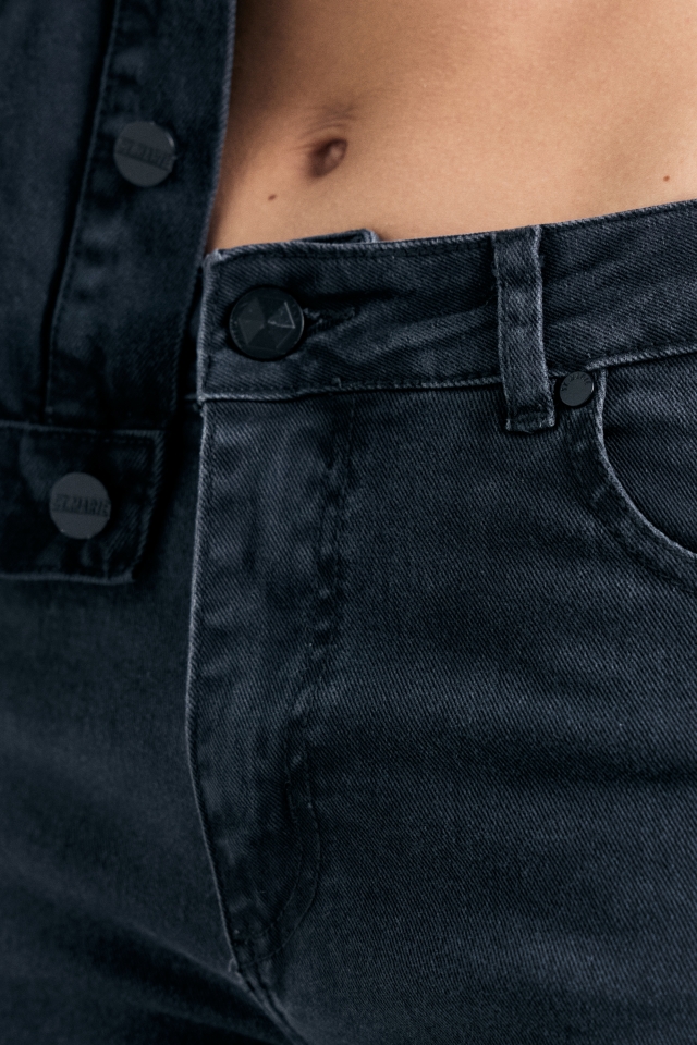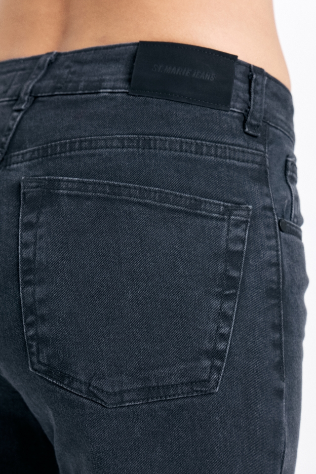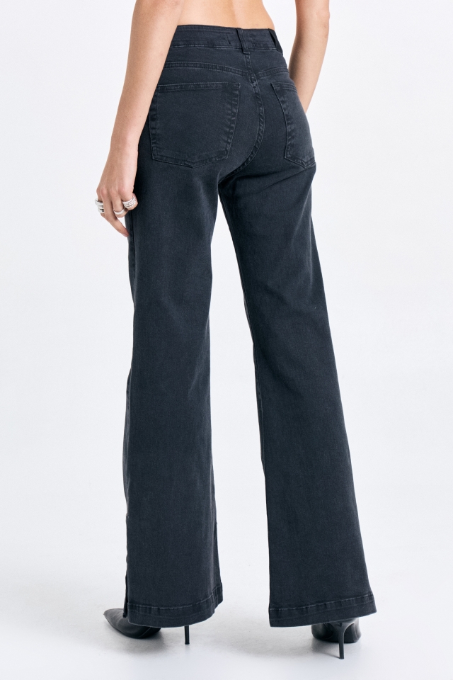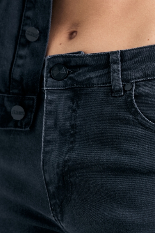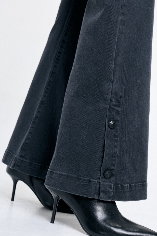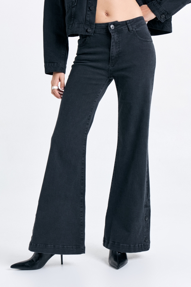 Jean cinco bolsillos tiro medio , con pierna ajustada que se va abriendo hacia la botamanga. Detalle de broches en tajos