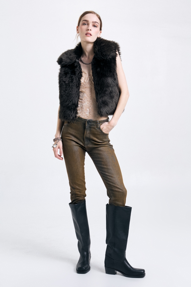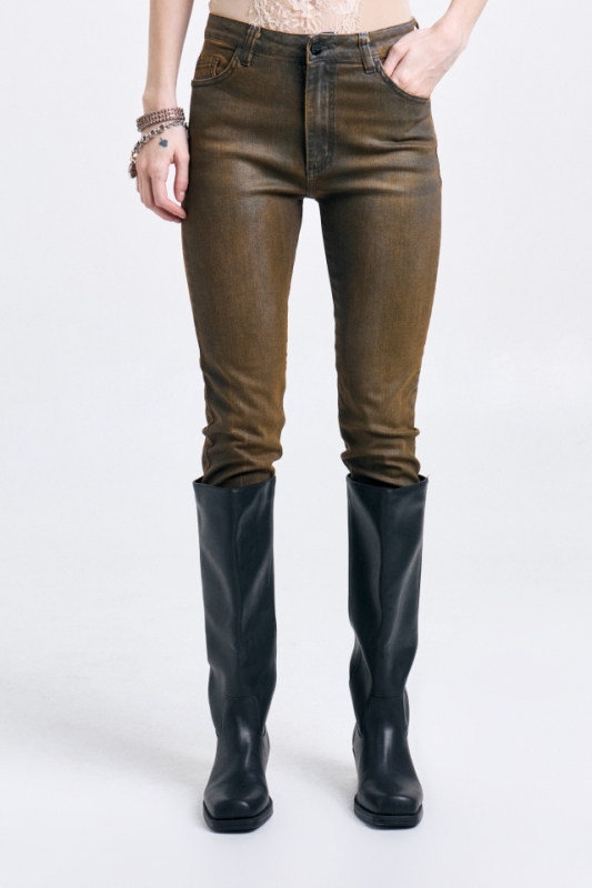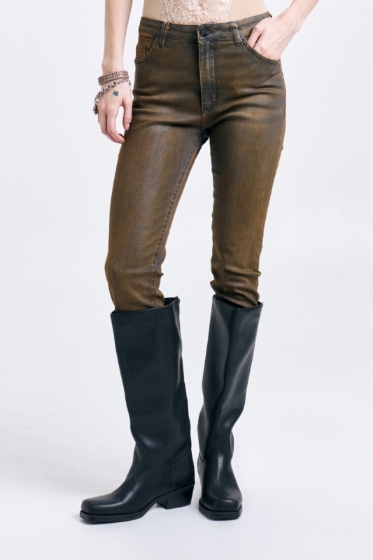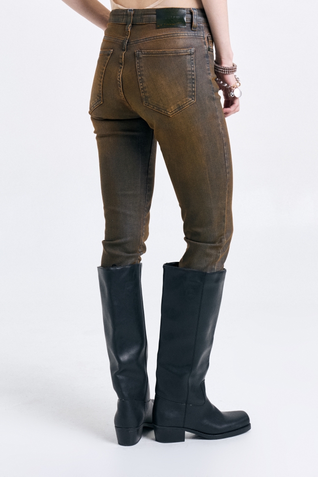 Jean skinny tiro medio, su pierna es entallada y posee 5 bolsillos. Complementado en cintura trasera con badana e identificación de marca. Lavado matizado oxido. Composición: 100% Algodón