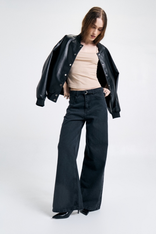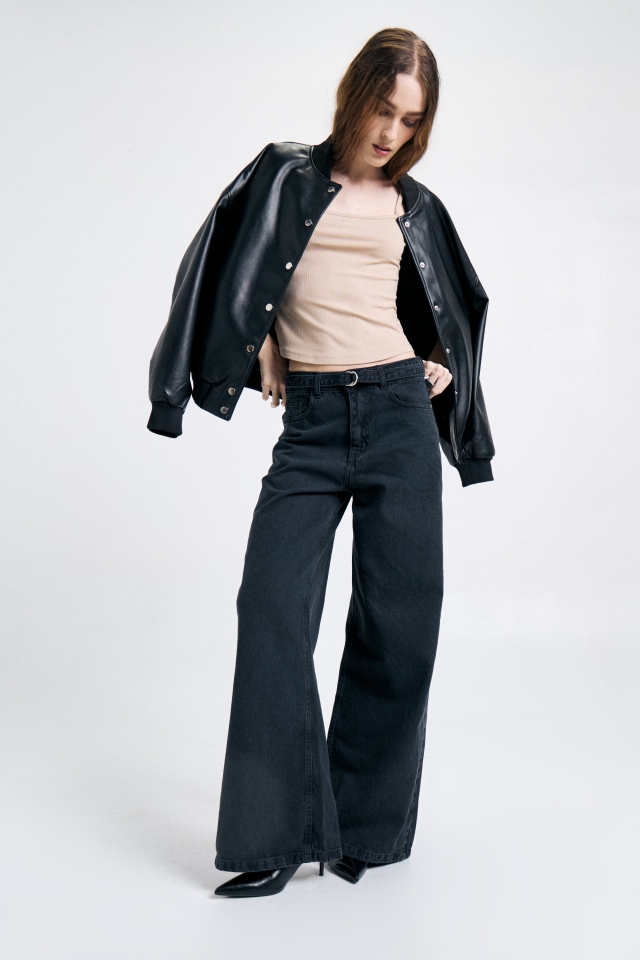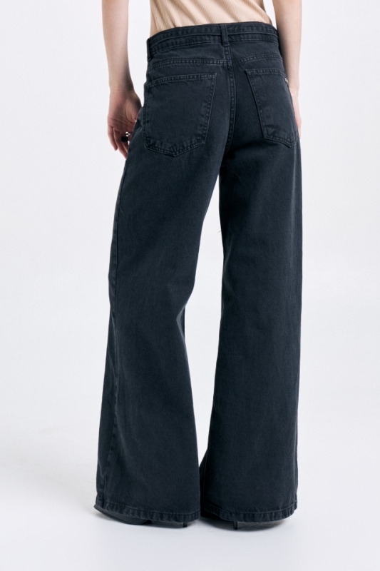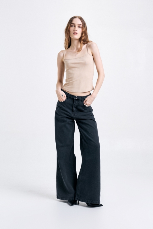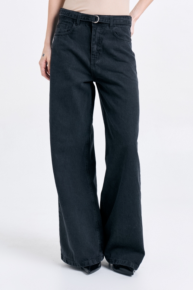 Jean calce Wide Leg, tiro alto de cinco bolsillos, cuenta con un cinturón incorporado en la prenda. En el bolisllo trasero lleva una chapita con identificación de marca.