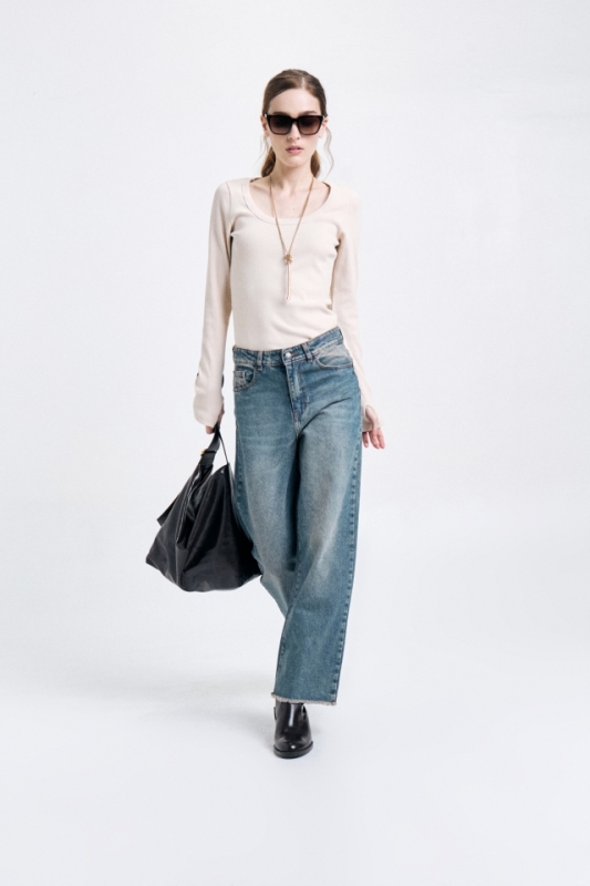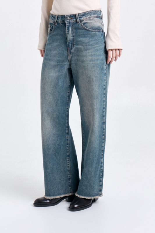 Jean de tiro medio 5 bolsillos con pierna recta y holgada . Largo al talon y lavado índigo claro con dobladillo al corteCOMPOSICIÓN: 100% Algodón