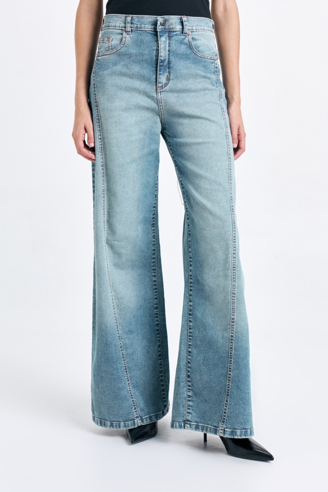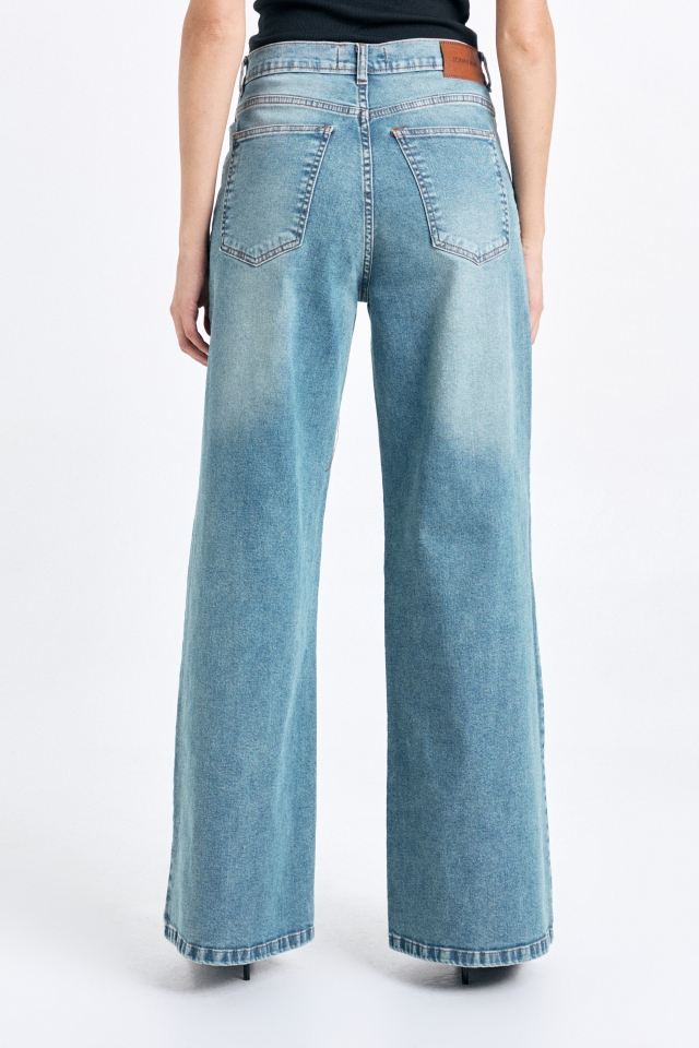 Jean Slime Wide, tiro alto, 5 bolsillos, con recortes verticales en el delantero. En la cintura trasera lleva badana de cuero con identificación de marca
