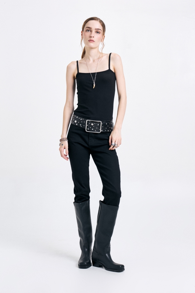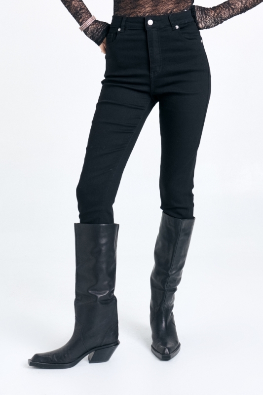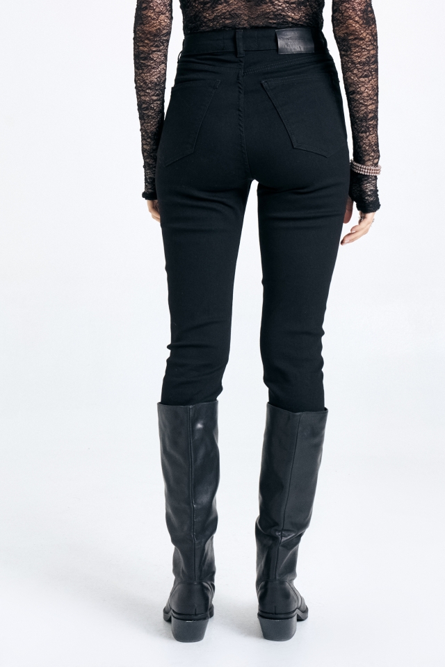 Jean skinny de tiro medio, el mismo posee cinco bolsillos los cuales están terminados con snaps metálicos que llevan inscripta la marca. En la cintura trasera se le colocó una badana de cuero que también cuenta con la identificación de marca.