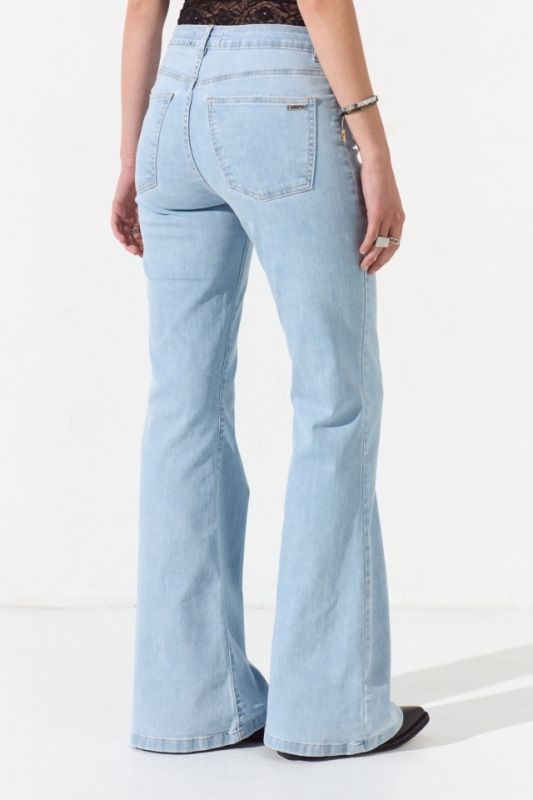 Jean de cinco bolsillos, cada uno de ellos terminado con snaps metálicos, su botamanga es de tipo oxford y en la cintura trasera lleva una badana camel con la identificación de marca.