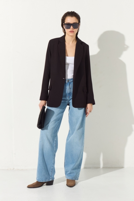 Jean de calce Wide Leg, posee tiro alto. Cuenta con 5 bolsillos, su delantero tiene terminación de snaps metálicos que combinan con el botón niquel que abrocha el delantero. En su cintura trasera tiene a modo de detalle una badana de piel con inscripción de marca en metal. La tela es rígida.