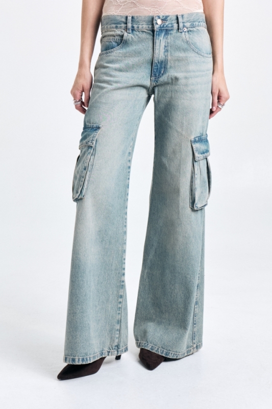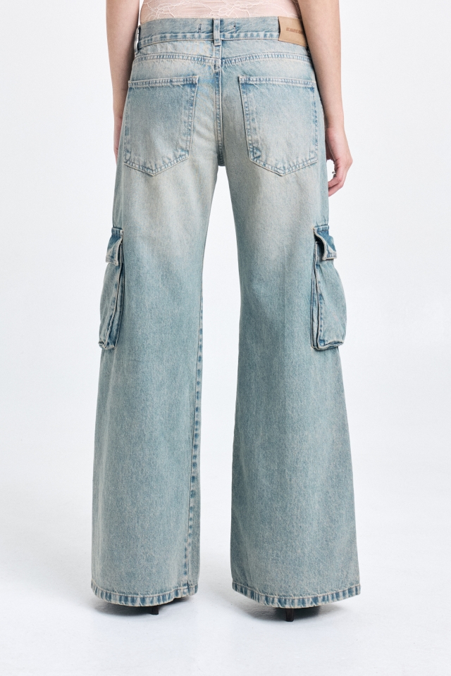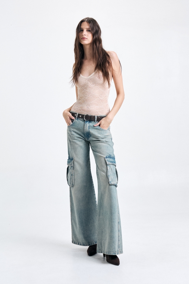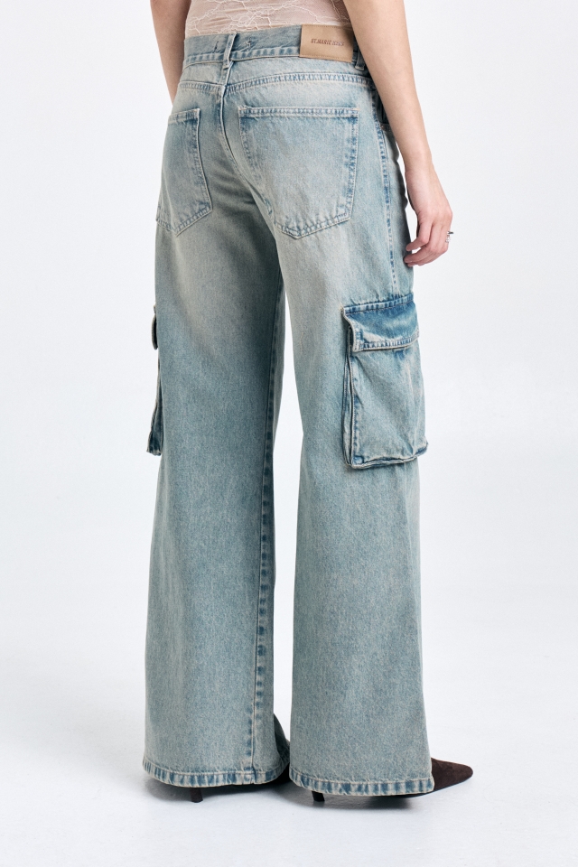 Jean cargo cinco bolsillos, corte wide leg, tiro medio.Posee badana con identificación de marca en cintura trasera.Composición: 100% Algodón