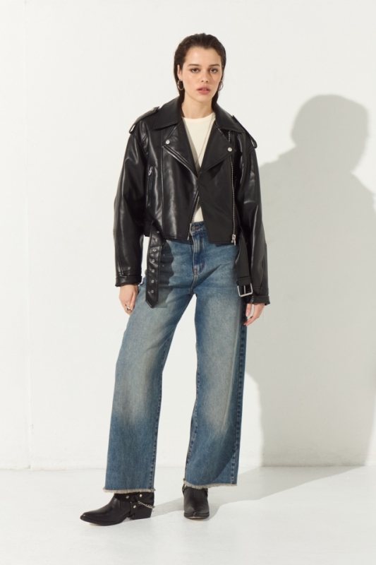 Detalle de badana de cuero en cintura con marca grabada.