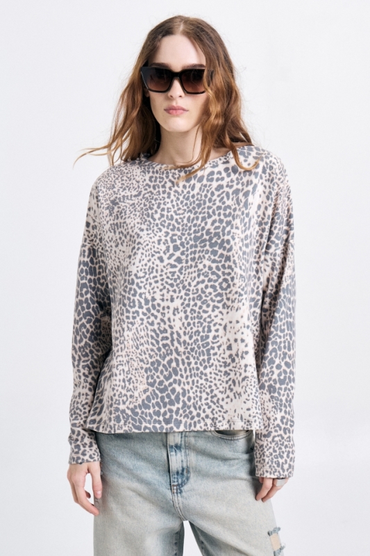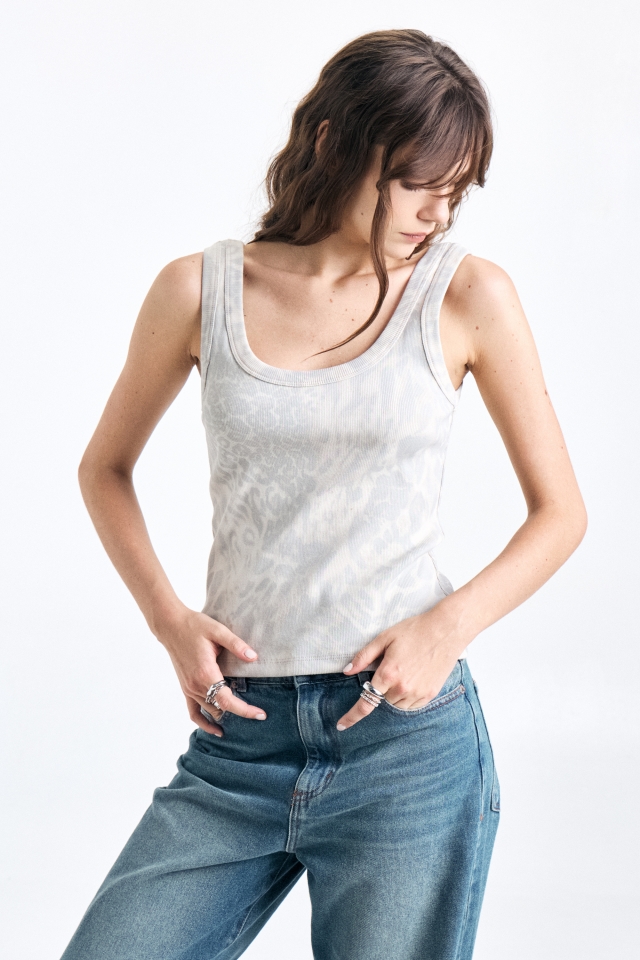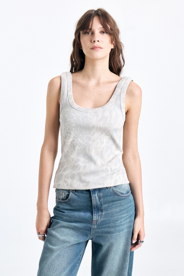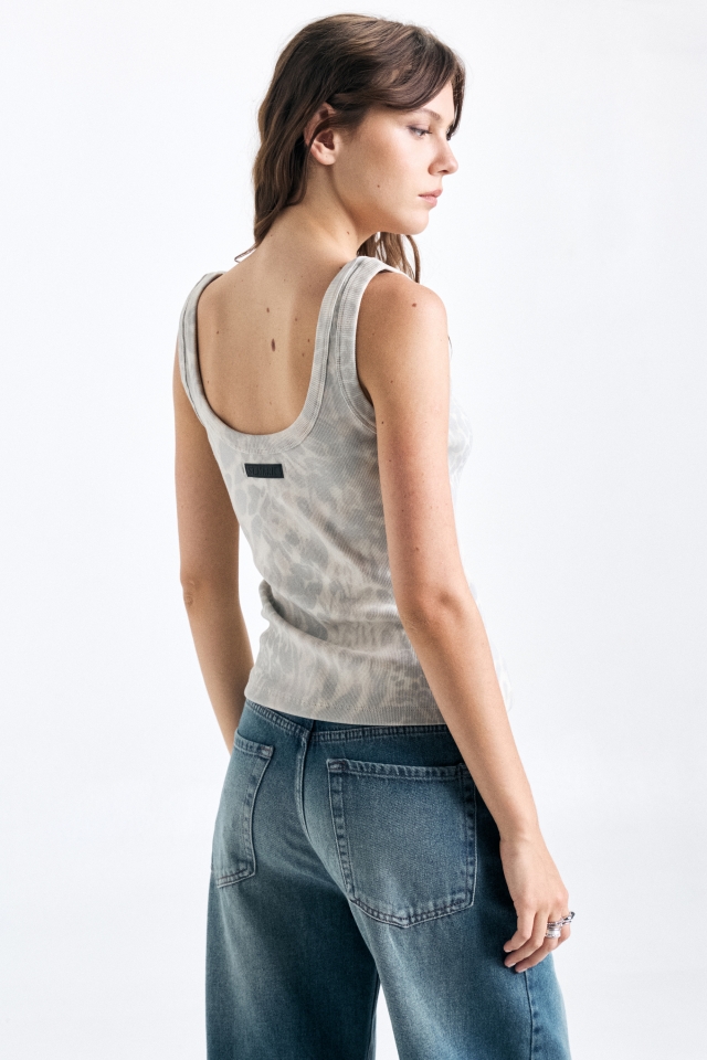 Musculosa escote U en morley pesado estampado en cheeta, con detalle de badana de marcaComposición: 60% Algodón 35% Poliéster 5% Spandex