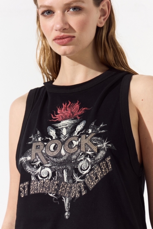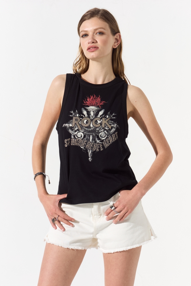 Musculosa corte clásico, confeccionada en jersey de algodón. Lleva estampa central con leyenda "ROCK", y recursos mixtos de tintas. En la espalda lleva grifa de marca. Composición: 100% algodón