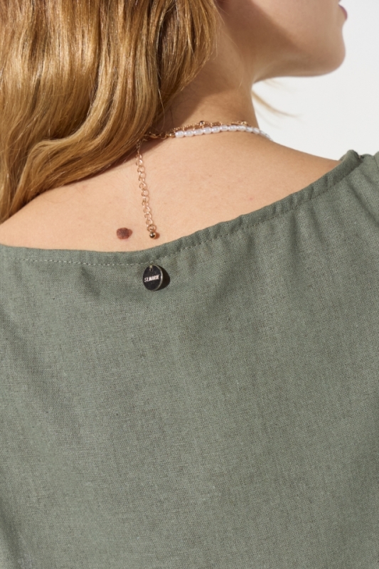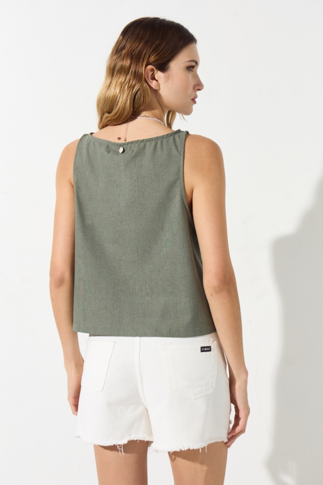 Musculosa de lino clasica, escote a la base, chapita personalizada en espalda