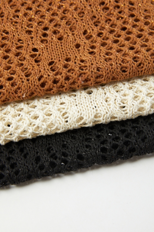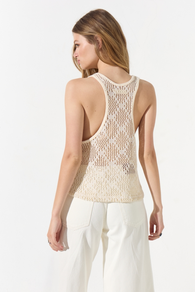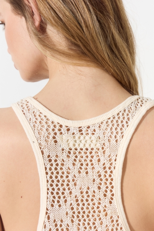Musculosa de crochet con hilo de lurex en su trama, su escote y sisas están terminados con ribb a tono. Composición: 71% Poliester 27% Cotton 2% Lurex