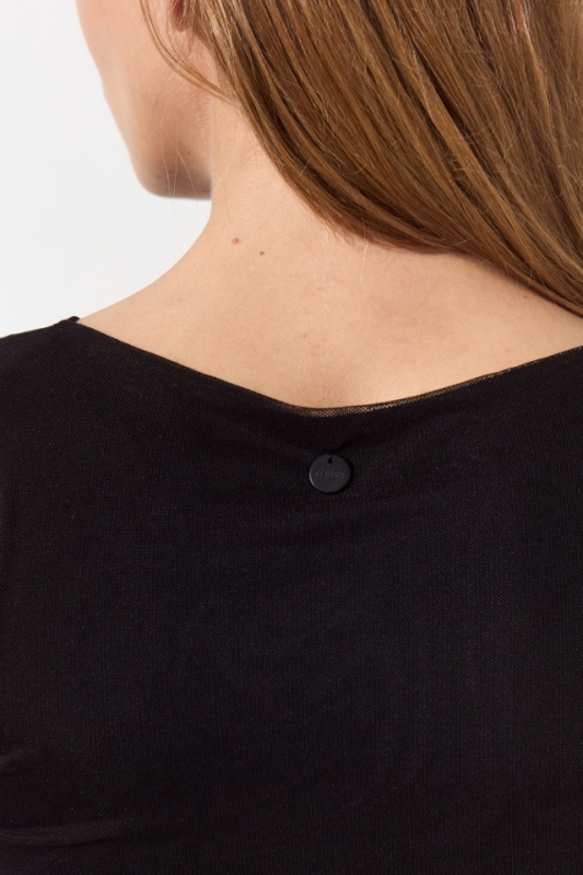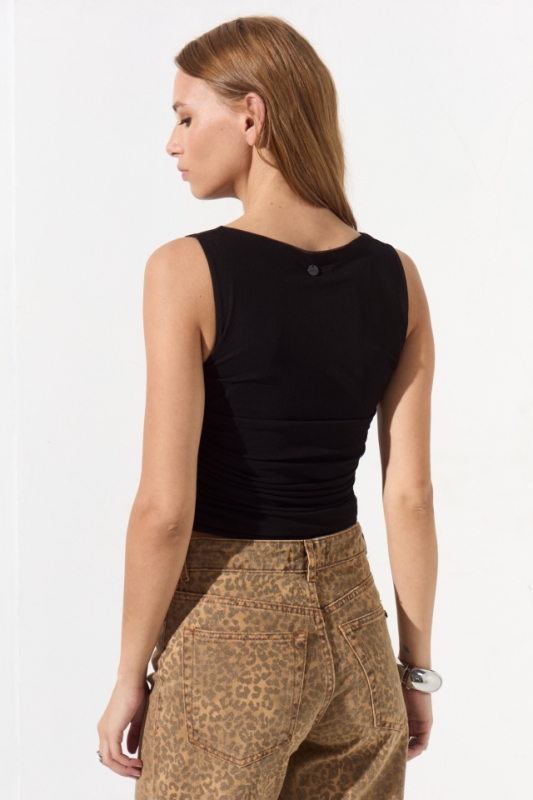 Musculosa de tul con estampado full animal print; la misma posee un escote redondo clásico, sus laterales están fruncidos y su delantero y espalda llevan forrería. A modo de detalle se le colocó un dije metálico con la identificación de la marca.
