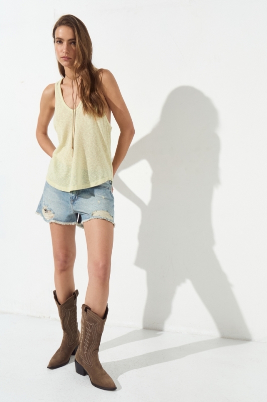 Musculosa de lino mell, con escote en v. La terminación del ruedo es redondeada acompaña el corte evasé de la prenda. En el centro de la espalda cuenta con una grifa a contratono personalizada con la marca.