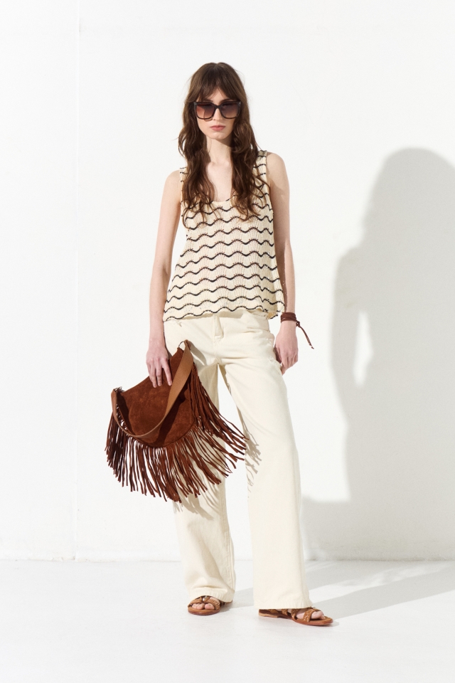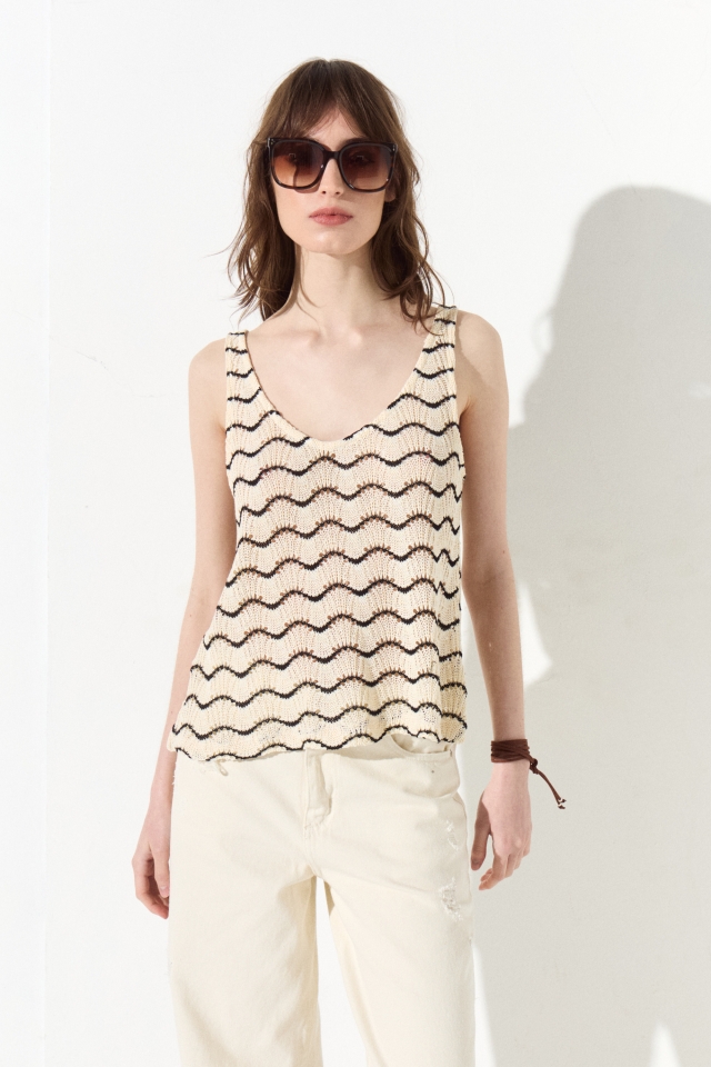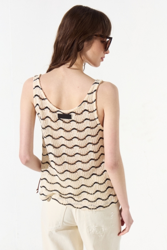 Musculosa de crochet con pequeñas caladuras, su escote redondeado está terminado con una guía interna que le brinda mayor estabilidad al producto. La tela cuenta con un estampado de líneas al horizontal que contrastan con el color de la tela base. A modo de detalle en el centro de su espalda se le colocó una badana de cuero con la identificación de la marca.