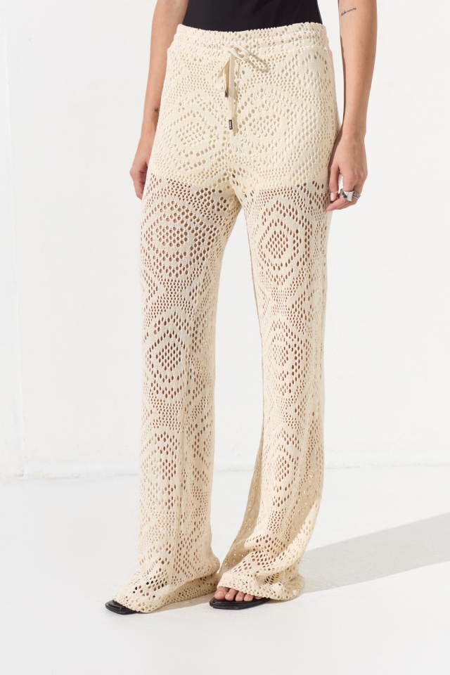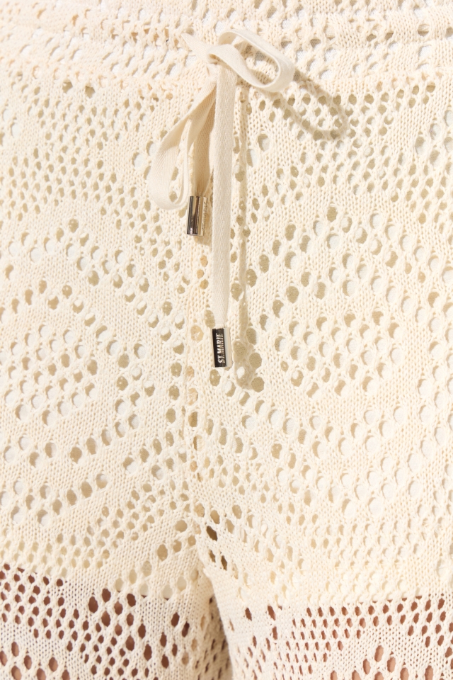 Pantalón pierna recta, confeccionado en tela crochet, con short interno incorporado. Posee cintura elastizada con elástico y tiras en cinta a tono, con terminación de puntera metálica. Composición: 72% Poliéster 28% Cotton