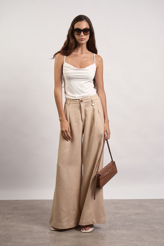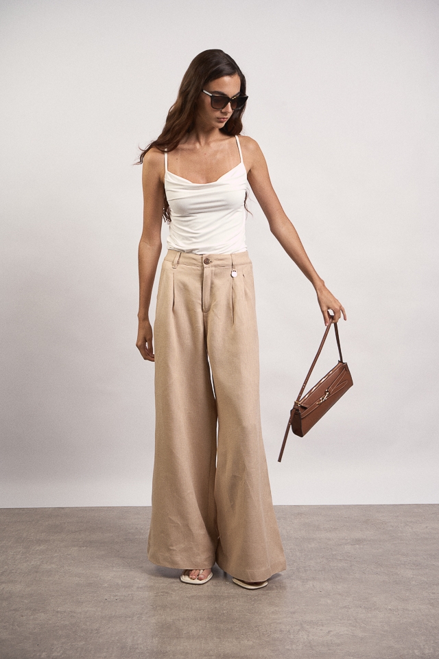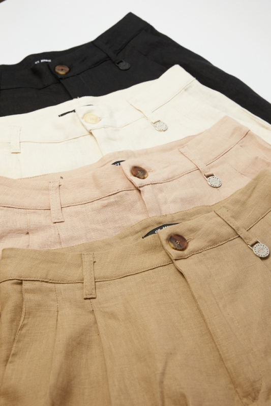Pantalón de lino sastrero, su calce es recto y posee dos pinzas en el delantero y el trasero. Abrocha con boton de pasta a tono, tiene presillas para pasador de cinturón.