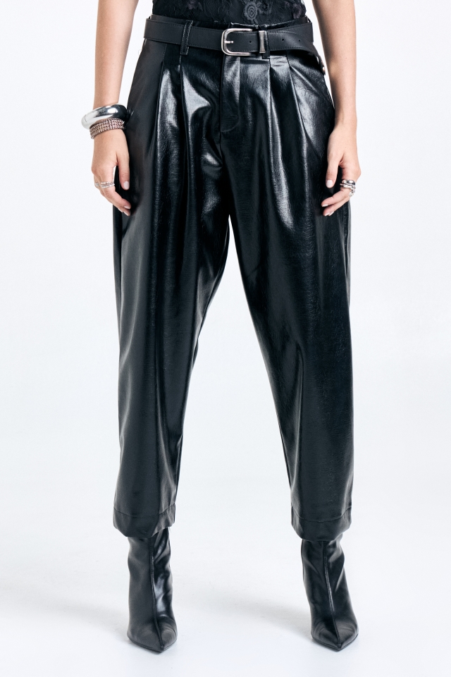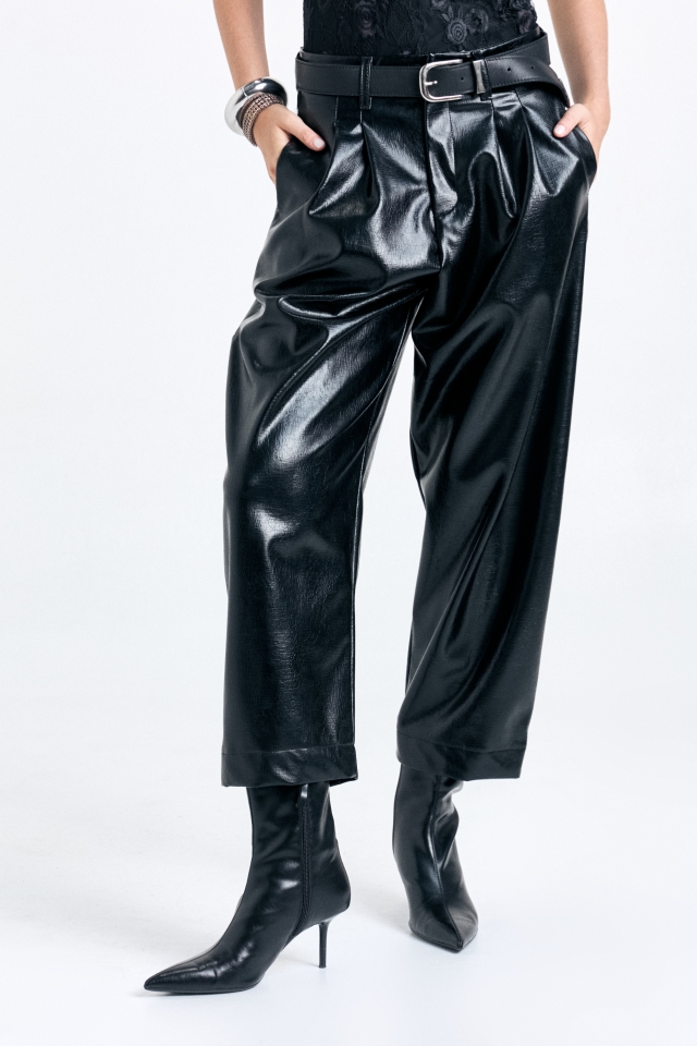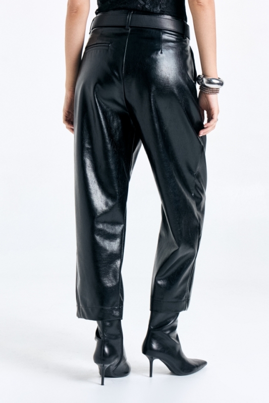 Pantalon de cuero quebrado con tablas en delantero y bolsillos en laterales, ademas posee un bolsillo ojal en trasero. Composición: 100% PU