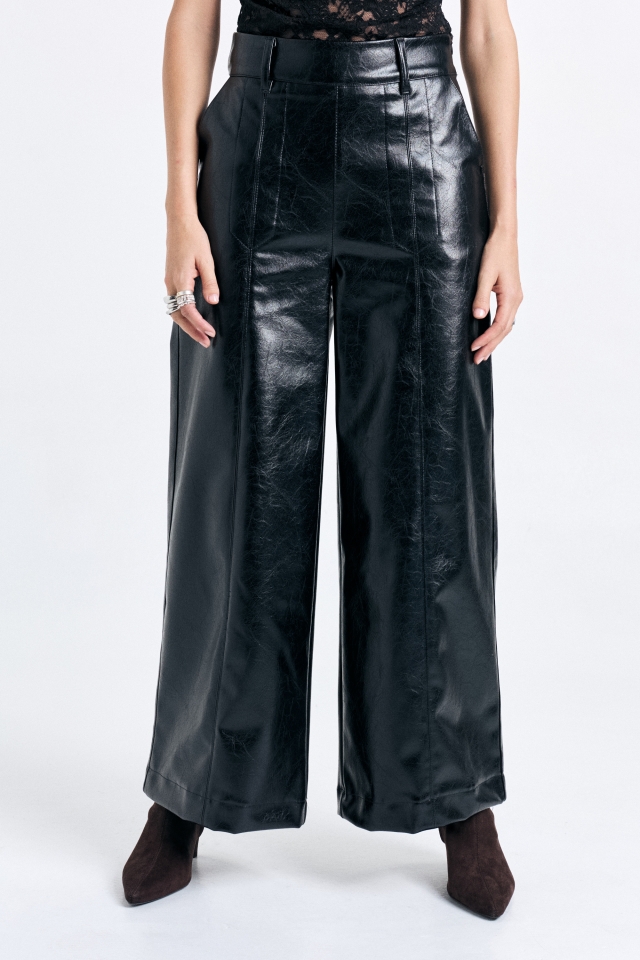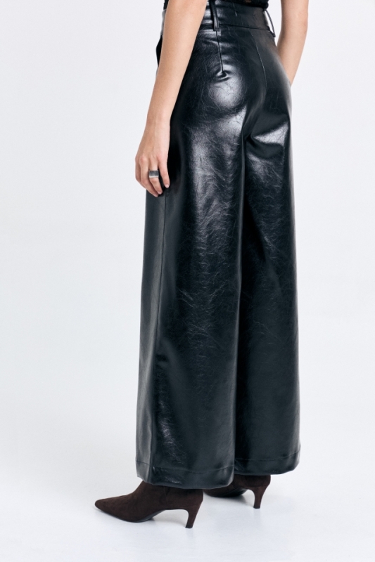 Pantalón pierna ancha, con recortes delanteros. Confeccionado en ecocuero quebrado. Lleva detalle de remache de marca en boca de bolsillo izquierdo. Composición: 50% poliéster 50% PU