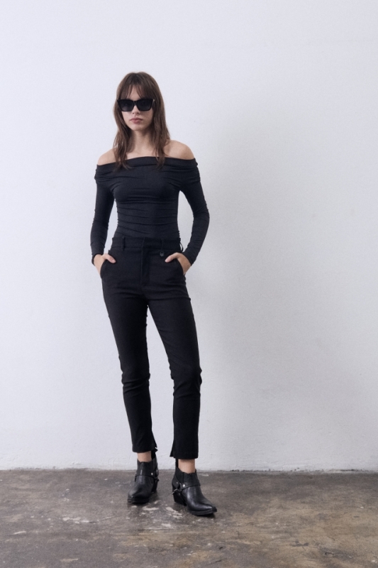 Pantalon de bengalina con corte sastrero y tajo lateral. Detalle de chapita personalizada.Composición: 75% Rayon - 21% Nylon - 4% Spandex.