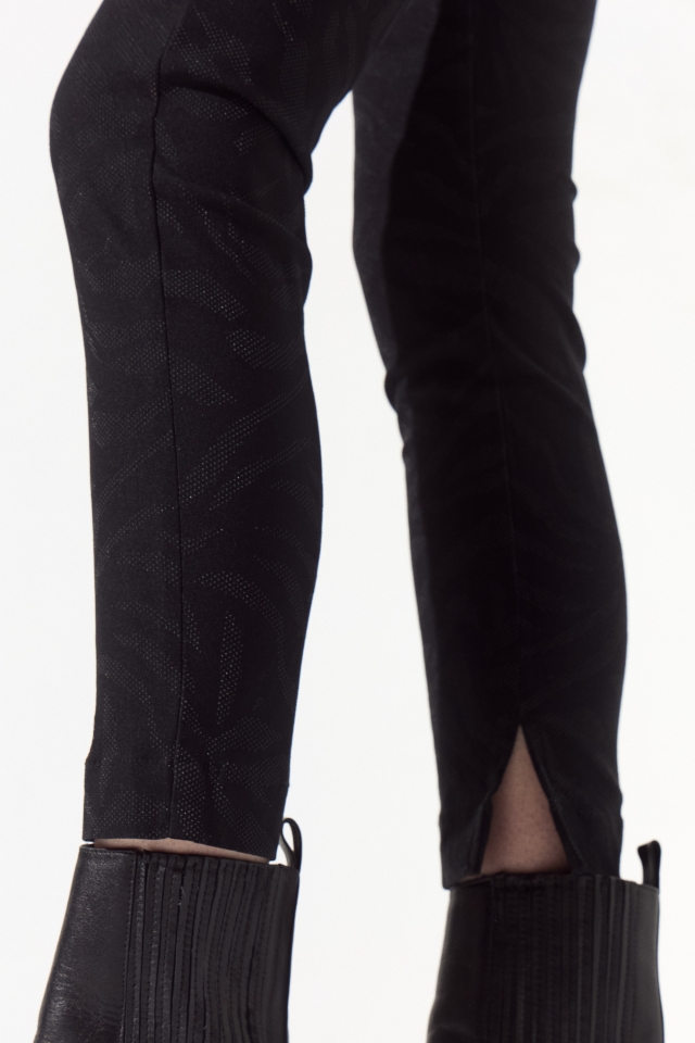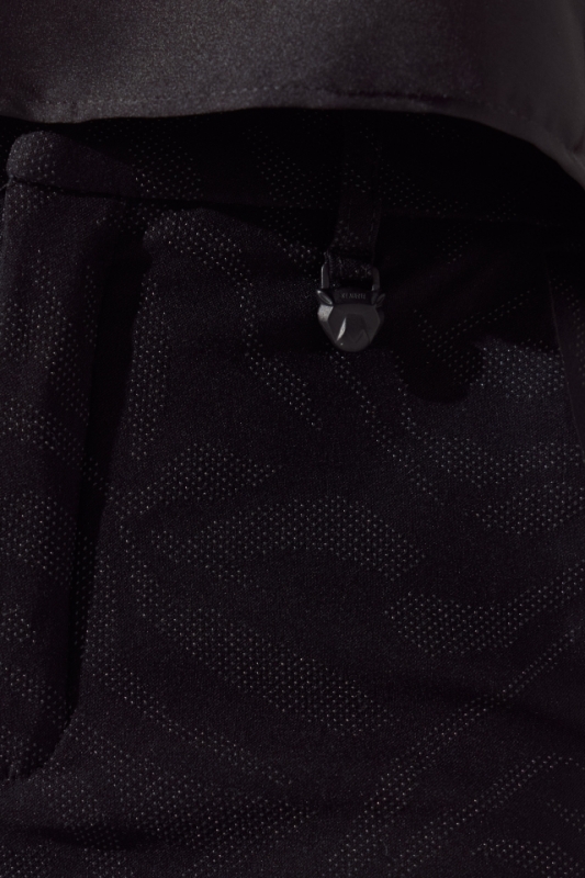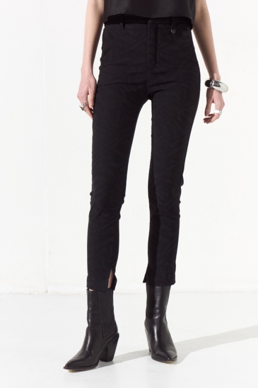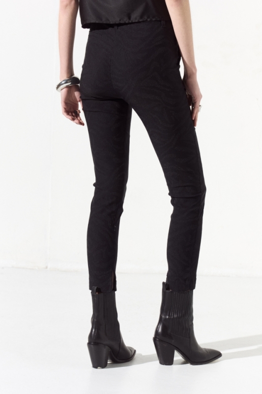 Pantalon de bengalina texturizada, el corte de la prenda es sastrero, cuenta con dos bolsillos laterales en su delantero y un bolsillo ojal en su trasero, a modo de detalle una de sus presillas lleva un colgante de tigre que identifica la marca.