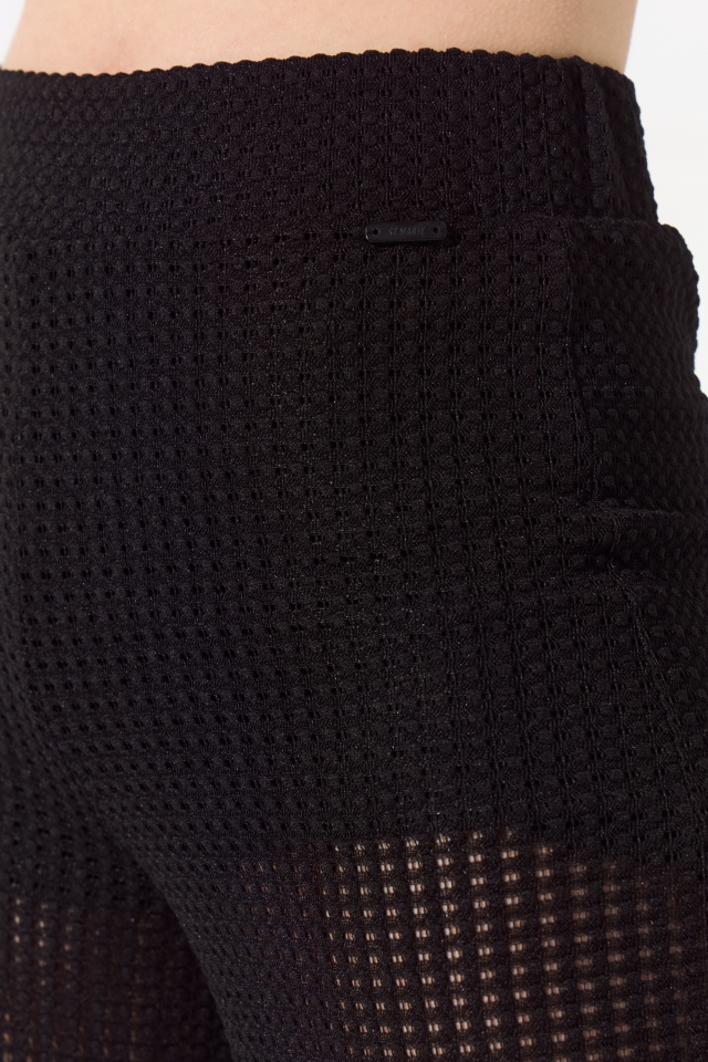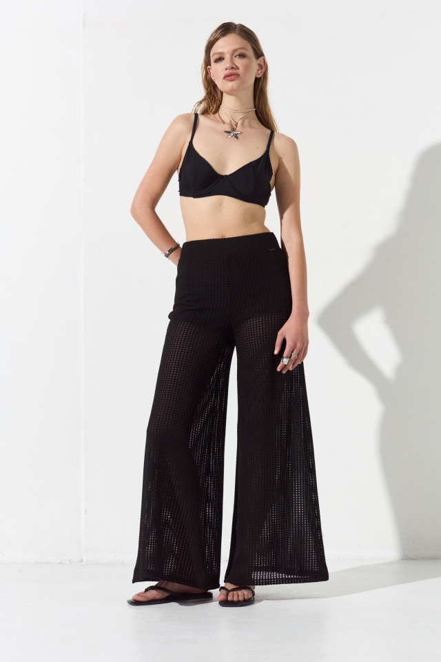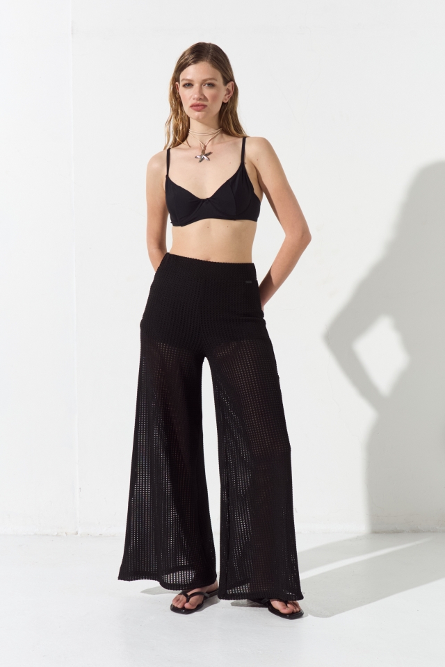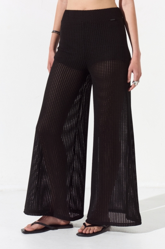 Pantalón de crochet, con calce tipo palazzo. El mismo posee cintura elastizada, y un short interior que complementa como forreria. A modo de detalle en su delantero lleva una chapita con la identificación de la marca.